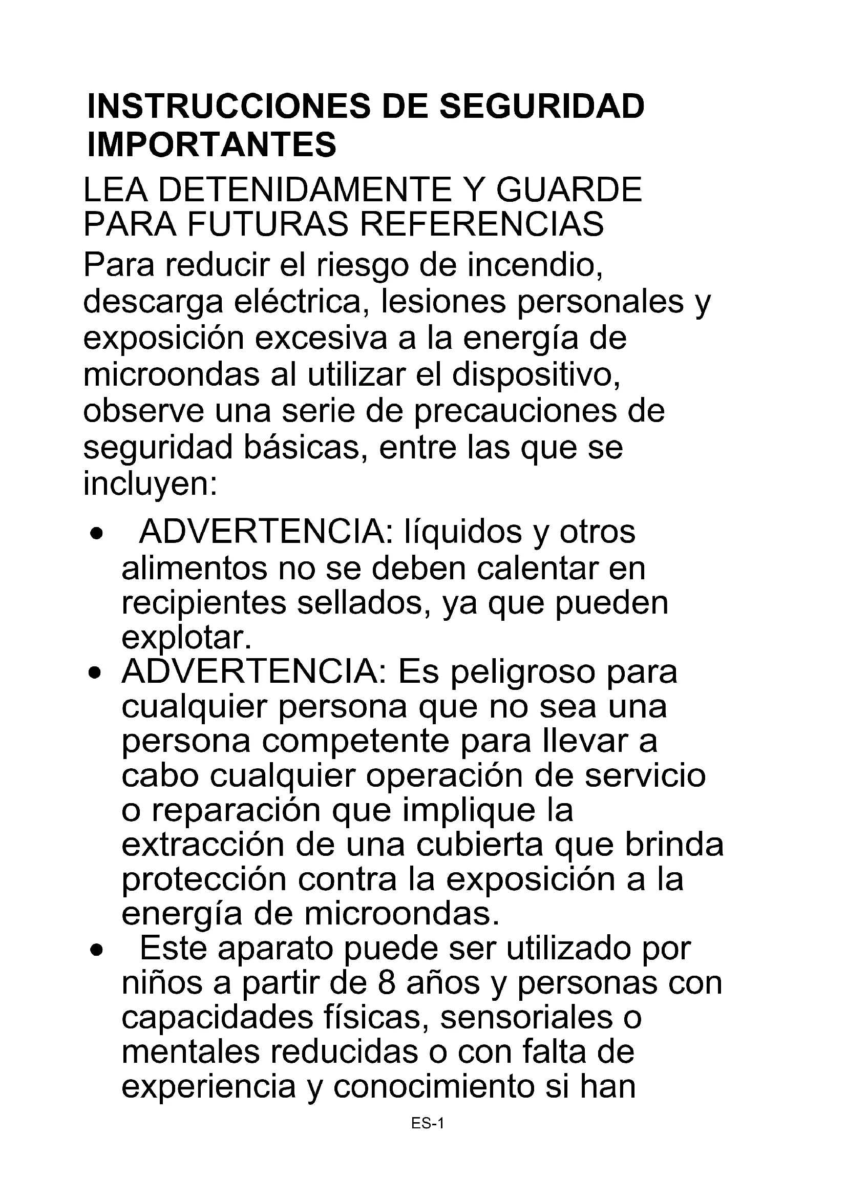 LEA DETENIDAMENTE Y GUARDE PARA FUTURAS REFERENCIAS Para reducir el riesgo de incendio, descarga electrica, lesiones personales y exposicion excessiva a la energia de microondas al utiliser el dispositivo, observe una série de precauciones de seguidadasicas,entre las que se incluyen: