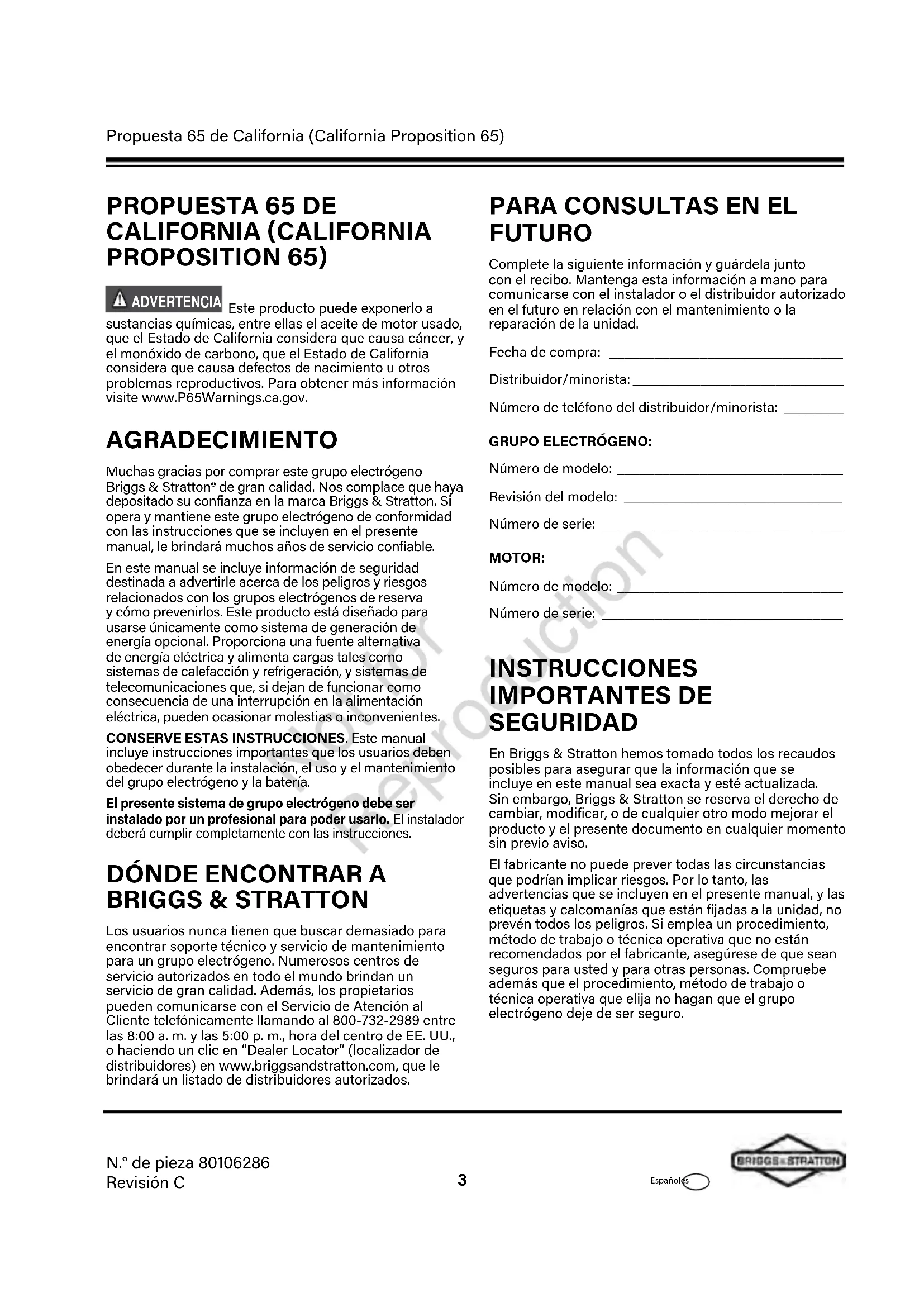 FUTURO Complete la siguiente información y guárdela junto con el recibo. Mantenga esta información a mano para comunicarse con el instalador o el distribuidor autorizado en el futuro en relación con el mantenimiento o la reparación de la unidad. Fecha de compra: _______________________________ Distribuidor/minorista: ____________________________ Número de teléfono del distribuidor/minorista: ________ GRUPO ELECTRÓGENO: Número de modelo: ______________________________ Revisión del modelo: _____________________________ Número de serie: ________________________________ MOTOR: Número de modelo: ______________________________ Número de serie: ________________________________ INSTRUCCIONES IMPORTANTES DE SEGURIDAD En Briggs & Stratton hemos tomado todos los recaudos posibles para asegurar que la información que se incluye en este manual sea exacta y esté actualizada. Sin embargo, Briggs & Stratton se reserva el derecho de cambiar, modificar, o de cualquier otro modo mejorar el producto y el presente documento en cualquier momento sin previo aviso. El fabricante no puede prever todas las circunstancias que podrían implicar riesgos. Por lo tanto, las advertencias que se incluyen en el presente manual, y las etiquetas y calcomanías que están fijadas a la unidad, no prevén todos los peligros. Si emplea un procedimiento, método de trabajo o técnica operativa que no están recomendados por el fabricante, asegúrese de que sean seguros para usted y para otras personas. Compruebe además que el procedimiento, método de trabajo o técnica operativa que elija no hagan que el grupo electrógeno deje de ser seguro. Not for Reproduction4 N.° de pieza 80106286Revisión CInstrucciones importantes de seguridadSímbolos de seguridad y su significadoEspañol es Símbolo de alerta de seguridad y palabras de aviso El símbolo de alerta de seguridad identifica la información de seguridad sobre peligros que pueden generar lesiones. El símbolo de alerta se utiliza con una palabra de aviso (PELIGRO, ADVERTENCIA o PRECAUCIÓN) para indicar la probabilidad de que ocurra una lesión y la posible gravedad de la misma. Además, un símbolo de peligro puede representar el tipo de peligro.PELIGROIndica un riesgo que, si no se evita,provocarálesiones graves o la muerte. ADVERTENCIA Indica un riesgo que, si no se evita, podría provocar lesiones graves o la muerte. PRECAUCIÓN Indica un riesgo que, si no se evita, podría provocar lesiones menores o moderadas. AVISO Indica información que se considera importante pero que no está relacionada con un riesgo. Símbolos de seguridad y su significado SÍMBOLO SIGNIFICADOSímbolo de alerta de seguridad. Indica un posible riesgo de lesiones.Lea este manual. Si no se respeta lo establecido en las advertencias, las instrucciones y en el Manual de Instalación y de Funcionamiento se podrían provocar lesiones graves o la muerte.IncendioExplosiónElectrocuciónGases tóxicosUtilice protección ocularProductos químicos peligrososSuperficie calienteArranque automático Not for ReproductionN.° de pieza 80106286 Revisión C