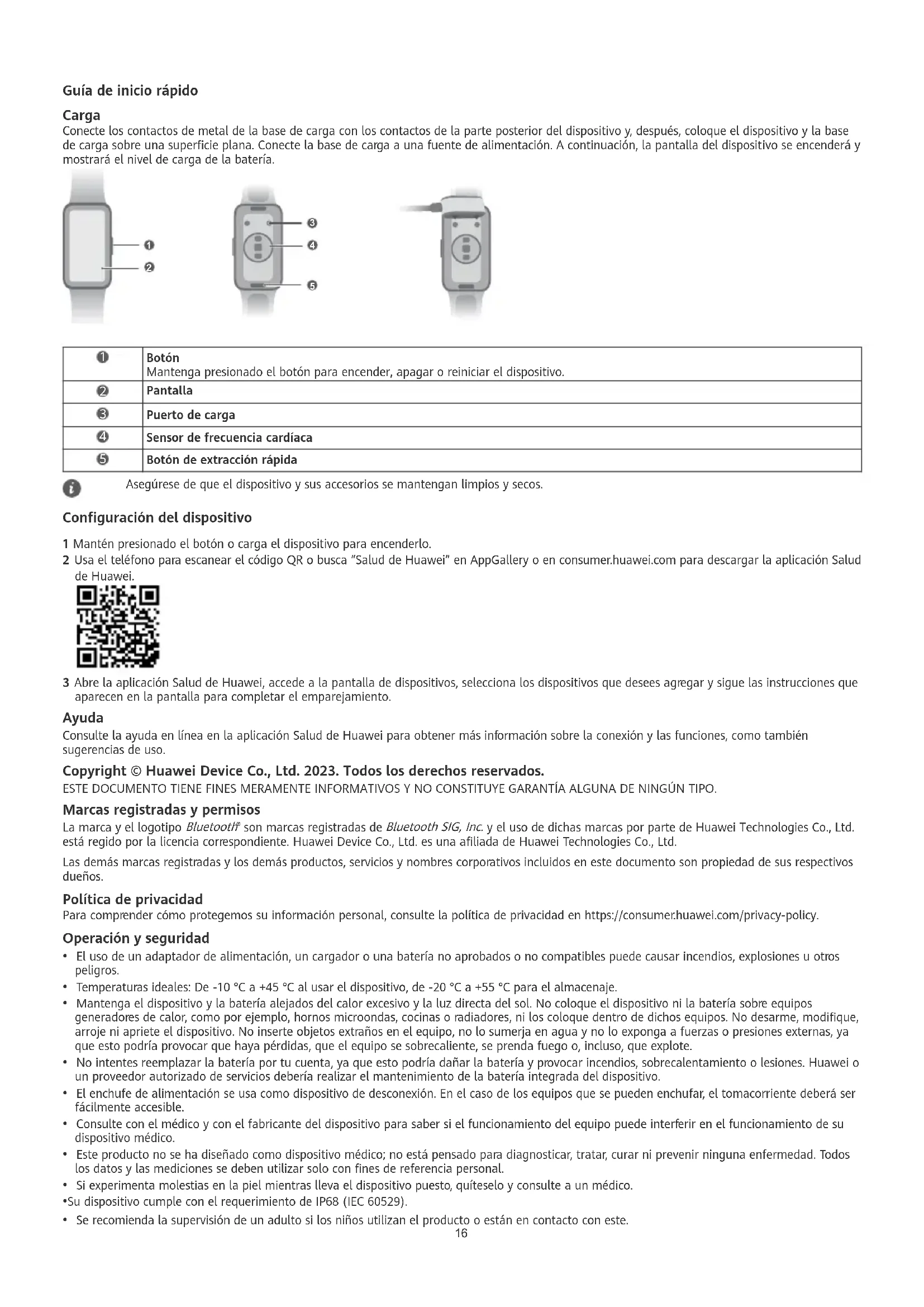 Botón de extracción rápida Asegúrese de que el dispositivo y sus accesorios se mantengan limpios y secos. Conguración del dispositivo 1 Mantén presionado el botón o carga el dispositivo para encenderlo. 2 Usa el teléfono para escanear el código QR o busca “Salud de Huawei” en AppGallery o en consumer.huawei.com para descargar la aplicación Salud de Huawei. 3 Abre la aplicación Salud de Huawei, accede a la pantalla de dispositivos, selecciona los dispositivos que desees agregar y sigue las instrucciones que aparecen en la pantalla para completar el emparejamiento. Ayuda Consulte la ayuda en línea en la aplicación Salud de Huawei para obtener más información sobre la conexión y las funciones, como también sugerencias de uso. Copyright © Huawei Device Co., Ltd. 2023. Todos los derechos reservados. ESTE DOCUMENTO TIENE FINES MERAMENTE INFORMATIVOS Y NO CONSTITUYE GARANTÍA ALGUNA DE NINGÚN TIPO. Marcas registradas y permisos La marca y el logotipo Bluetooth