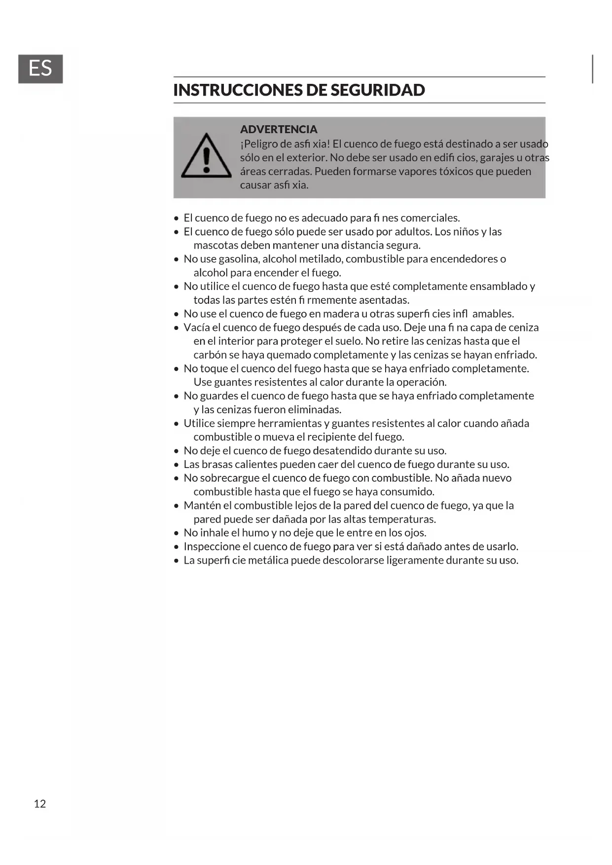 ADVERTENCIA ¡Peligro de as xia! El cuenco de fuego está destinado a ser usado sólo en el exterior. No debe ser usado en edi cios, garajes u otras áreas cerradas. Pueden formarse vapores tóxicos que pueden causar as xia.