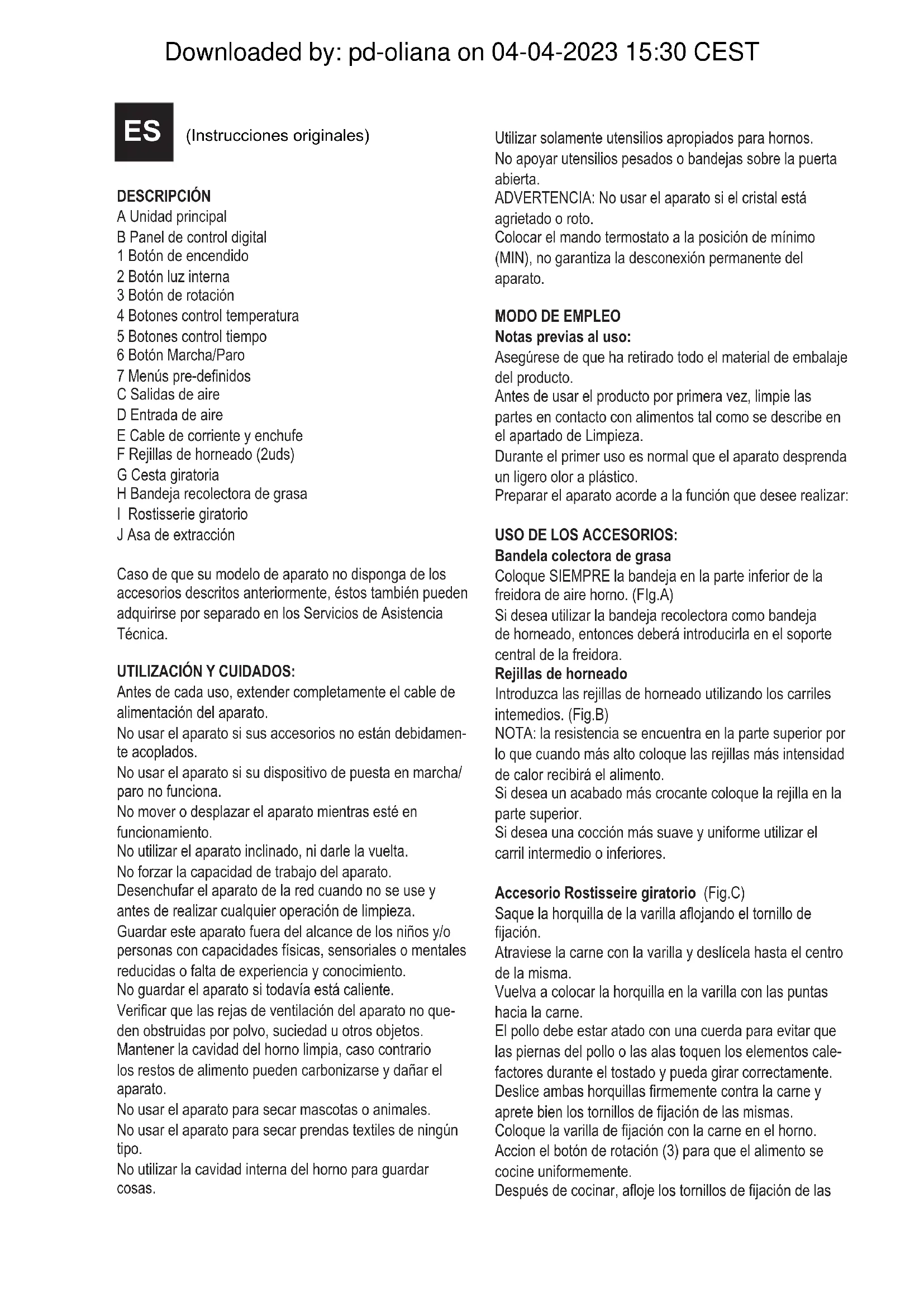 Downloaded by: pd-oliana on 04-04-2023 15:30 CESTFig. A Fig. C Fig. B Fig. D Fig. E Downloaded by: pd-oliana on 04-04-2023 15:30 CESTDESCRIPCIÓN A Unidad principal B Panel de control digital 1 Botón de encendido 2 Botón luz interna 3 Botón de rotación 4 Botones control temperatura 5 Botones control tiempo 6 Botón Marcha/Paro 7 Menús pre-denidos C Salidas de aire D Entrada de aire E Cable de corriente y enchufe F Rejillas de horneado (2uds) G Cesta giratoria H Bandeja recolectora de grasa I Rostisserie giratorio J Asa de extracción Caso de que su modelo de aparato no disponga de los accesorios descritos anteriormente, éstos también pueden adquirirse por separado en los Servicios de Asistencia Técnica. UTILIZACIÓN Y CUIDADOS: Antes de cada uso, extender completamente el cable de alimentación del aparato. No usar el aparato si sus accesorios no están debidamen- te acoplados. No usar el aparato si su dispositivo de puesta en marcha/ paro no funciona. No mover o desplazar el aparato mientras esté en funcionamiento. No utilizar el aparato inclinado, ni darle la vuelta. No forzar la capacidad de trabajo del aparato. Desenchufar el aparato de la red cuando no se use y antes de realizar cualquier operación de limpieza. Guardar este aparato fuera del alcance de los niños y/o personas con capacidades físicas, sensoriales o mentales reducidas o falta de experiencia y conocimiento. No guardar el aparato si todavía está caliente. Vericar que las rejas de ventilación del aparato no que- den obstruidas por polvo, suciedad u otros objetos. Mantener la cavidad del horno limpia, caso contrario los restos de alimento pueden carbonizarse y dañar el aparato. No usar el aparato para secar mascotas o animales. No usar el aparato para secar prendas textiles de ningún tipo. No utilizar la cavidad interna del horno para guardar cosas. Utilizar solamente utensilios apropiados para hornos. No apoyar utensilios pesados o bandejas sobre la puerta abierta. ADVERTENCIA: No usar el aparato si el cristal está agrietado o roto. Colocar el mando termostato a la posición de mínimo (MIN), no garantiza la desconexión permanente del aparato.