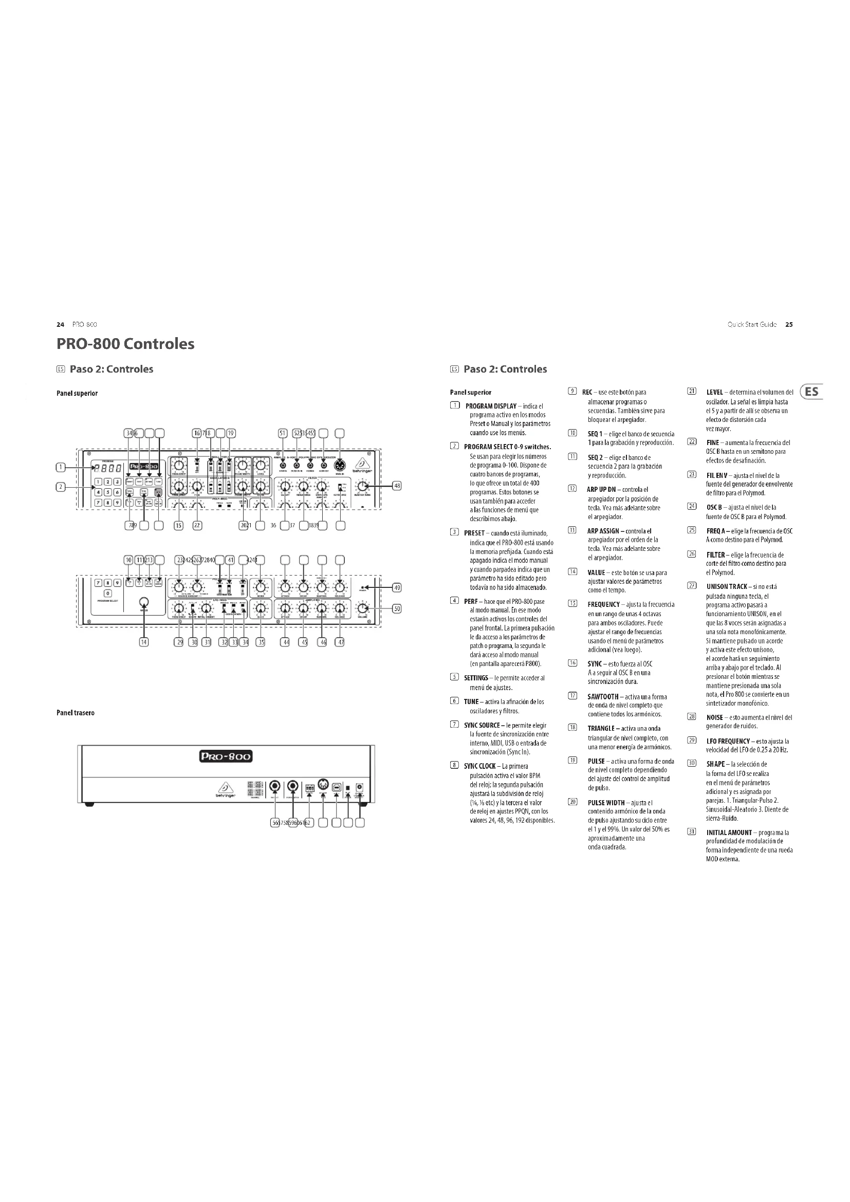 (ES) Paso 2: Controles Panel superior Panel trasero 24 25Quick Start GuidePRO-800 Panel superior (1) PROGRAM DISPLAY – indica el programa activo en los modos Preset o Manual y los parámetros cuando use los menús. (2) PROGRAM SELECT 0-9 switches. Se usan para elegir los números de programa 0-100. Dispone de cuatro bancos de programas, lo que ofrece un total de 400 programas. Estos botones se usan también para acceder a las funciones de menú que describimos abajo. (3) PRESET – cuando está iluminado, indica que el PRO-800 está usando la memoria prejada. Cuando está apagado indica el modo manual y cuando parpadea indica que un parámetro ha sido editado pero todavía no ha sido almacenado. (4) PERF – hace que el PRO-800 pase al modo manual. En ese modo estarán activos los controles del panel frontal. La primera pulsación le da acceso a los parámetros de patch o programa, la segunda le dará acceso al modo manual (en pantalla aparecerá P800). (5) SETTINGS – le permite acceder al menú de ajustes. (6) TUNE – activa la anación de los osciladores y ltros. (7) SYNC SOURCE – le permite elegir la fuente de sincronización entre interno, MIDI, USB o entrada de sincronización (Sync In). (8) SYNC CLOCK – La primera pulsación activa el valor BPM del reloj; la segunda pulsación ajustará la subdivisión de reloj (¼, ⁄ etc) y la tercera el valor de reloj en ajustes PPQN, con los valores 24, 48, 96, 192 disponibles. (9) REC – use este botón para almacenar programas o secuencias. También sirve para bloquear el arpegiador. (10) SEQ 1 – elige el banco de secuencia 1 para la grabación y reproducción. (11) SEQ 2 – elige el banco de secuencia 2 para la grabación y reproducción. (12) ARP UP DN – controla el arpegiador por la posición de tecla. Vea más adelante sobre el arpegiador. (13) ARP ASSIGN – controla el arpegiador por el orden de la tecla. Vea más adelante sobre el arpegiador. (14) VALUE – este botón se usa para ajustar valores de parámetros como el tempo. (15) FREQUENCY – ajusta la frecuencia en un rango de unas 4 octavas para ambos osciladores. Puede ajustar el rango de frecuencias usando el menú de parámetros adicional (vea luego). (16) SYNC – esto fuerza al OSC A a seguir al OSC B en una sincronización dura. (17) SAWTOOTH – activa una forma de onda de nivel completo que contiene todos los armónicos. (18) TRIANGLE – activa una onda triangular de nivel completo, con una menor energía de armónicos. (19) PULSE – activa una forma de onda de nivel completo dependiendo del ajuste del control de amplitud de pulso. (20) PULSE WIDTH – ajusta el contenido armónico de la onda de pulso ajustando su ciclo entre el 1 y el 99%. Un valor del 50% es aproximadamente una onda cuadrada. (21) LEVEL – determina el volumen del oscilador. La señal es limpia hasta el 5 y a partir de allí se observa un efecto de distorsión cada vez mayor. (22) FINE – aumenta la frecuencia del OSC B hasta en un semitono para efectos de desanación. (23) FIL ENV – ajusta el nivel de la fuente del generador de envolvente de ltro para el Polymod. (24) OSC B – ajusta el nivel de la fuente de OSC B para el Polymod. (25) FREQ A – elige la frecuencia de OSC A como destino para el Polymod. (26) FILTER – elige la frecuencia de corte del ltro como destino para el Polymod. (27) UNISON TRACK – si no está pulsada ninguna tecla, el programa activo pasará a funcionamiento UNISON, en el que las 8 voces serán asignadas a una sola nota monofónicamente. Si mantiene pulsado un acorde y activa este efecto unísono, el acorde hará un seguimiento arriba y abajo por el teclado. Al presionar el botón mientras se mantiene presionada una sola nota, el Pro 800 se convierte en un sintetizador monofónico. (28) NOISE – esto aumenta el nivel del generador de ruidos. (29) LFO FREQUENCY – esto ajusta la velocidad del LFO de 0.25 a 20 Hz. (30) SHAPE – la selección de la forma del LFO se realiza en el menú de parámetros adicional y es asignada por parejas. 1. Triangular-Pulso 2. Sinusoidal-Aleatorio 3. Diente de sierra-Ruido. (31) INITIAL AMOUNT – programa la profundidad de modulación de forma independiente de una rueda MOD externa. (ES) Paso 2: Controles26 27Quick Start GuidePRO-800 (32) FREQ A-B – aplica la modulación LFO a la frecuencia de ambos osciladores. (33) PW A-B – aplica la modulación LFO a la amplitud de pulso de ambos osciladores. (34) FILTER – aplica la modulación LFO a la frecuencia de corte del ltro. (35) GLIDE – esto aumenta el portamento entre las notas. (36) CUTOFF – ajusta la frecuencia de corte del ltro pasabajos de 24 dB/ octava (4 polos). (37) RESONANCE – ajusta la resonancia del ltro. Esto enfatiza las frecuencias que están alrededor del punto de corte. (38) ENVELOPE AMOUNT – esto ajusta la profundidad de la envolvente aplicada. Si lo ajusta a 0, la envolvente de ltro no tendrá efecto. (39) KEYBOARD – cuando elija la posición FULL, será aplicado CV (voltaje de control) a la frecuencia de corte de los ltros con el ltro controlando el teclado. Con la posición OFF, las notas más altas que toque en el teclado tendrán una mayor supresión de sobretonos que las notas de registros más bajos. El ajuste ½ le ofrece un efecto que está entre los valores FULL y OFF. El ajuste FULL permite un ltro de auto- oscilación para un control más preciso del teclado. (40) ATTACK – controla el tiempo de ataque de la envolvente del ltro. (41) DECAY – controla el tiempo de decaimiento de la envolvente del ltro. (42) SUSTAIN – controla el nivel de sustain de la envolvente del ltro. (43) RELEASE – controla el tiempo de salida o nalización de la envolvente del ltro. (44) ATTACK – controla el tiempo de ataque de la envolvente de amplicación. (45) DECAY – controla el tiempo de decaimiento de la envolvente de amplicación. (46) SUSTAIN – controla el nivel de sustain de la envolvente de amplicación. (47) RELEASE – controla el tiemp