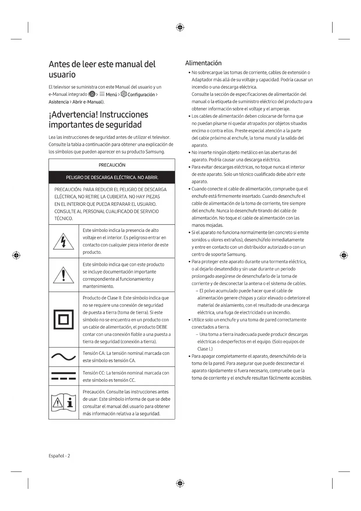 TÉCNICO. Este símbolo indica la presencia de alto voltaje en el interior. Es peligroso entrar en contacto con cualquier pieza interior de este producto. Este símbolo indica que con este producto se incluye documentación importante correspondiente al funcionamiento y mantenimiento. Producto de Clase II: Este símbolo indica que no se requiere una conexión de seguridad de puesta a tierra (toma de tierra). Si este símbolo no se encuentra en un producto con un cable de alimentación, el producto DEBE contar con una conexión fiable a una puesta a tierra de seguridad (conexión a tierra). Tensión CA: La tensión nominal marcada con este símbolo es tensión CA. Tensión CC: La tensión nominal marcada con este símbolo es tensión CC. Precaución. Consulte las instrucciones antes de usar: Este símbolo informa de que se debe consultar el manual del usuario para obtener más información relativa a la seguridad. Alimentación