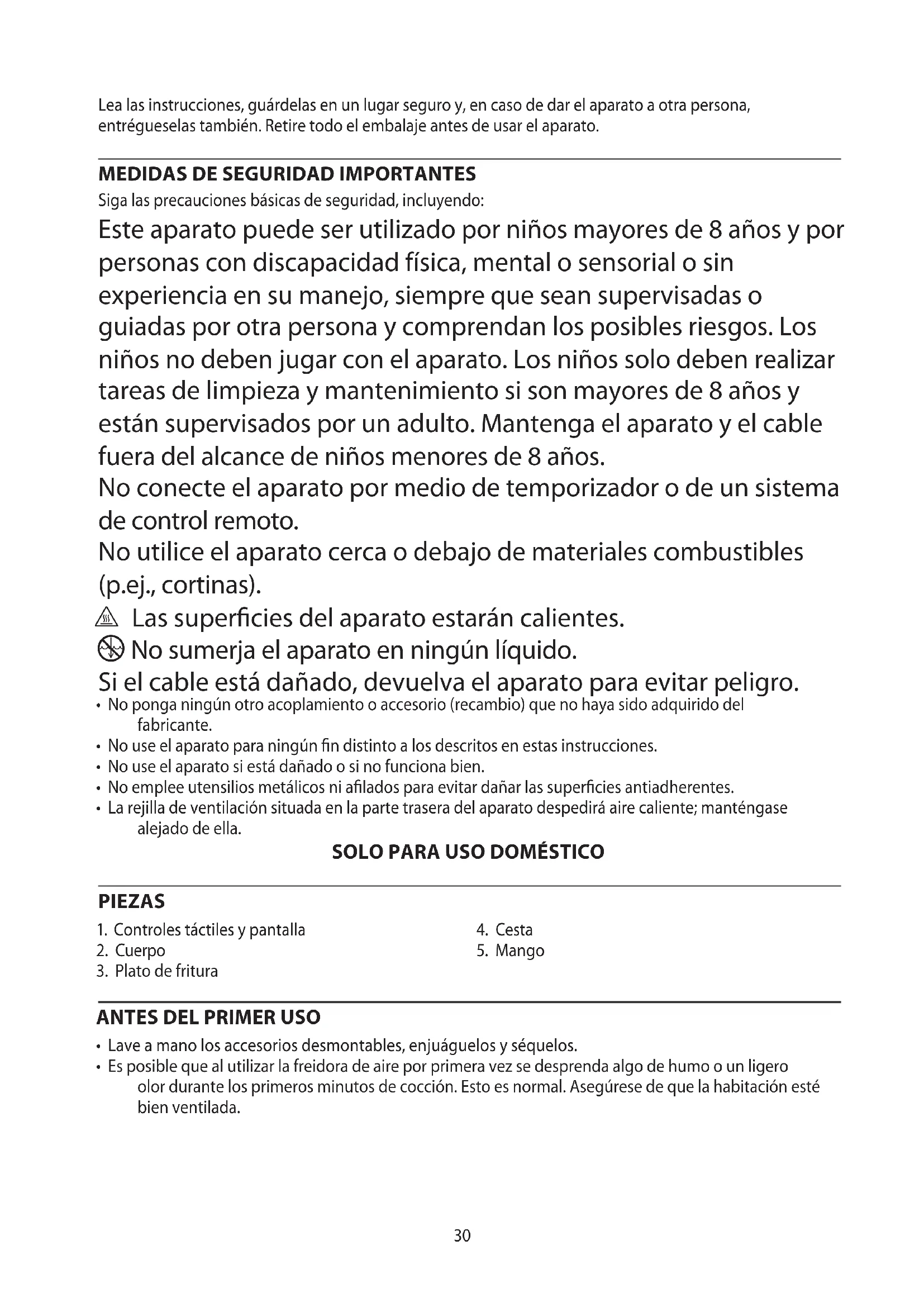 Siga las precauciones básicas de seguridad, incluyendo: Este aparato puede ser utilizado por niños mayores de 8 años y por personas con discapacidad física, mental o sensorial o sin experiencia en su manejo, siempre que sean supervisadas o guiadas por otra persona y comprendan los posibles riesgos. Los niños no deben jugar con el aparato. Los niños solo deben realizar tareas de limpieza y mantenimiento si son mayores de 8 años y están supervisados por un adulto. Mantenga el aparato y el cable fuera del alcance de niños menores de 8 años. No conecte el aparato por medio de temporizador o de un sistema de control remoto. No utilice el aparato cerca o debajo de materiales combustibles (p.ej., cortinas). ¬ Las superficies del aparato estarán calientes. i No sumerja el aparato en ningún líquido. Si el cable está dañado, devuelva el aparato para evitar peligro.