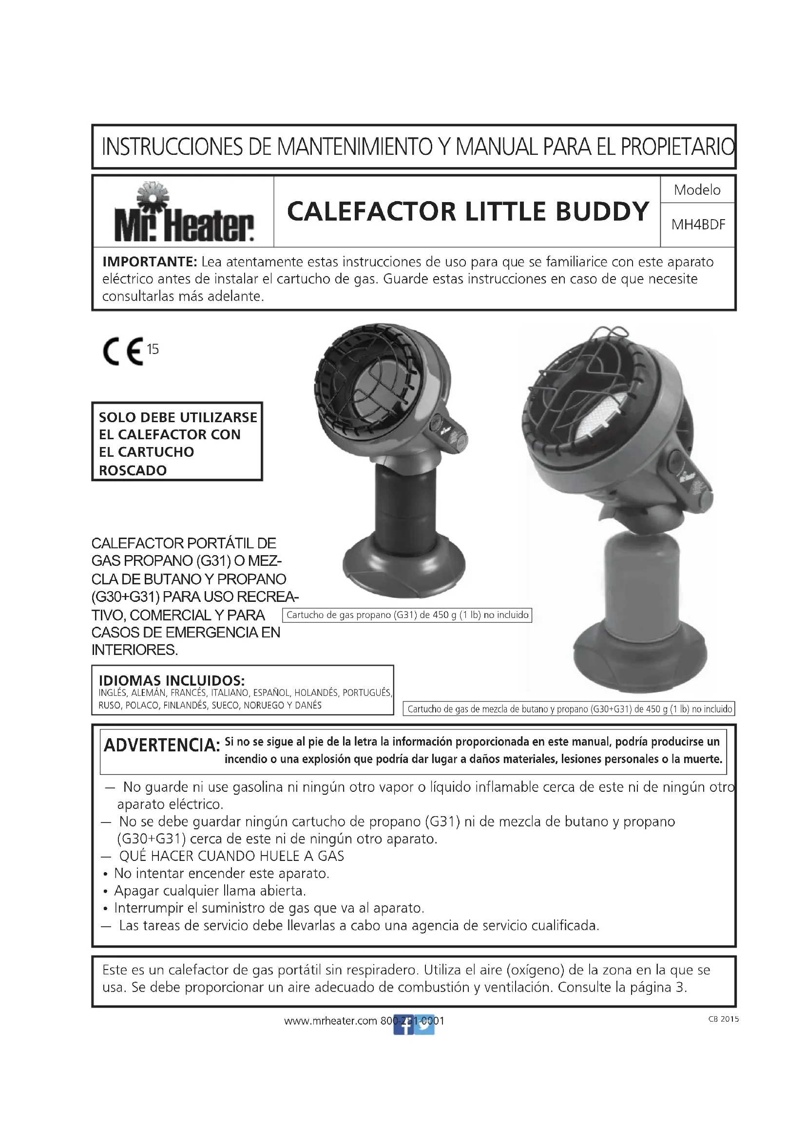 Mr. Heater, Inc. garantiza que sus calefactores y accesorios estarán libres de defectos de materiales y de mano de obra durante un período de 1 año a partir del momento de la compra. Mr. Heater, Inc. reparará o reemplazará este producto sin cargo alguno si se ha demostrado que tenía algún defecto en dicho período de 1 año y se ha devuelto al minorista con el comprobante de compra dentro del plazo de la garantía. LEA ATENTAMENTE LAS INSTRUCCIONES: Lea y cumpla todas las instrucciones. Guarde las instrucciones en un lugar seguro por si necesita consultarlas más adelante. No permita que ninguna persona que no se haya leído estas instrucciones monte, encienda, ajuste ni utilice el calefactor. MH4BDF Modelo REGISTRO DEL PRODUCTO: Gracias por su compra. Inicie sesión en http://www.egiregistration.com para registrar su producto. CALEFACTOR LITTLE BUDDYwww.mrheater.com 800-251-0001CB 2015 se non ci si attiene rigorosamente alle informazioni di questo manuale, è possibile che si veri- fichi di un incendio o un’esplosione e di conseguenza danni materiali, lesioni personali o morte. ATTENZIONE: