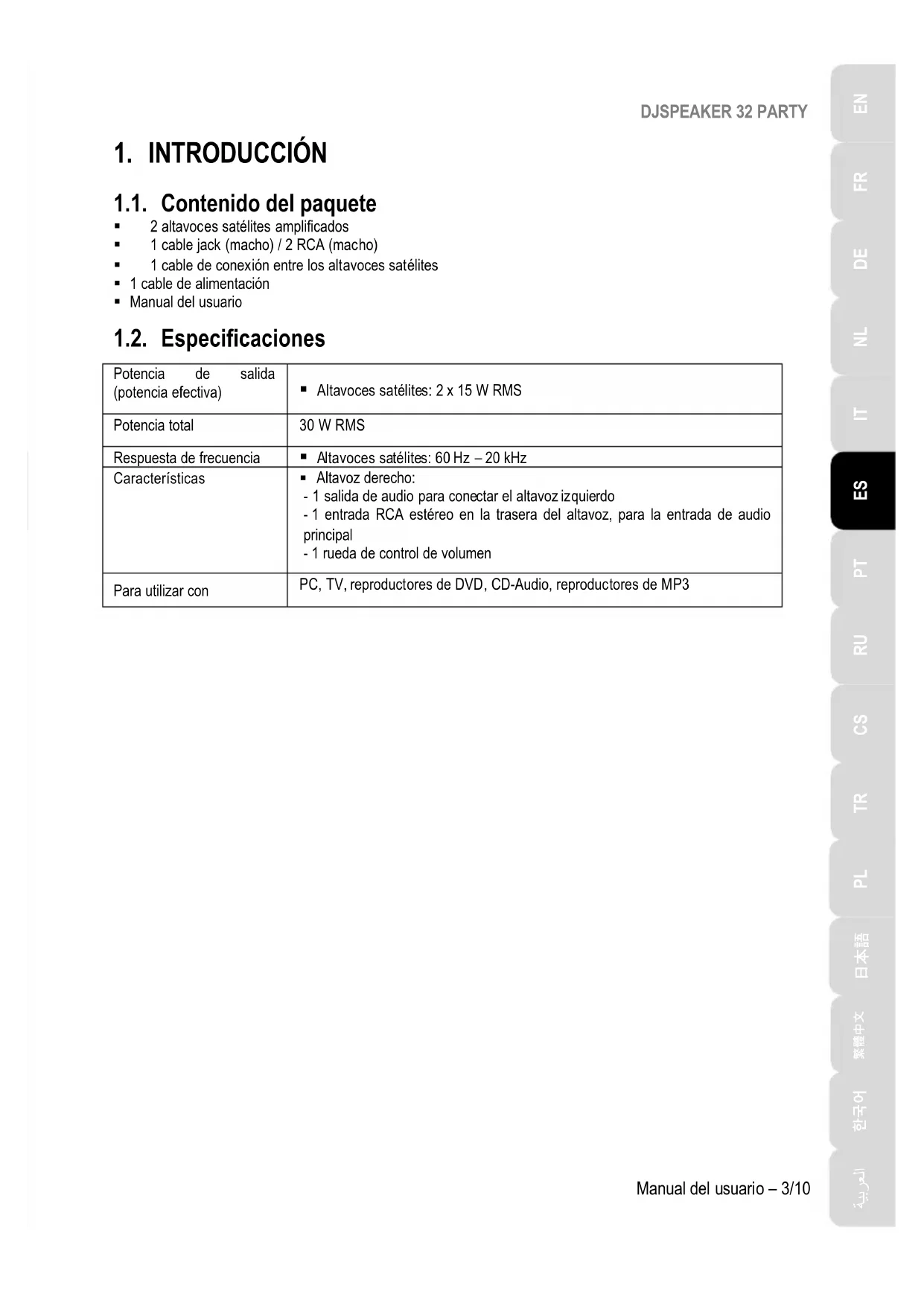 Altavoz derecho: - 1 salida de audio para conectar el altavoz izquierdo - 1 entrada RCA estéreo en la trasera del altavoz, para la entrada de audio principal - 1 rueda de control de volumen Para utilizar con PC, TV, reproductores de DVD, CD-Audio, reproductores de MP3DJSPEAKER 32 PARTY 4/10 – Manual del usuario 1.3. Recomendaciones - Coloca los altavoces satélites sobre una superficie plana para evitar que se puedan caer. - No abras el kit de altavoces, ya que te arriesgas a dañar sus componentes internos. - Este kit de altavoces está pensado para ser utilizado en un ambiente templado. - Para evitar el riesgo de incendio o descarga eléctrica, mantén alejado el kit de altavoces de: - lluvia o humedad, así como de fluidos (agua, productos químicos u otros líquidos), - fuentes de calor como calentadores, estufas u otros dispositivos que produzcan calor (incluyendo amplificadores), - la luz directa del sol. - No expongas el kit de altavoces a gotas ni a salpicaduras de agua. - No coloques ningún objeto lleno de líquido (vaso, jarrón...) sobre el kit de altavoces. - Desenchufa el cable de alimentación si no piensas utilizar el kit de altavoces durante un período de tiempo prolongado. Para desconectar el cable de alimentación, sujeta la clavija y tira de ella; no tires nunca del cable. - Asegúrate de que se pueda acceder fácilmente a la clavija de alimentación del kit de altavoces enchufado a una toma eléctrica. - Desenchufa el kit de altavoces antes de limpiarlo. Utiliza un paño húmedo y evita utilizar limpiadores en aerosol. - La clavija de alimentación del kit de altavoces sirve para apagarlo y, por lo tanto, debe ser fácilmente accesible en todo momento. - En la parte trasera de los altavoces están las indicaciones legales.