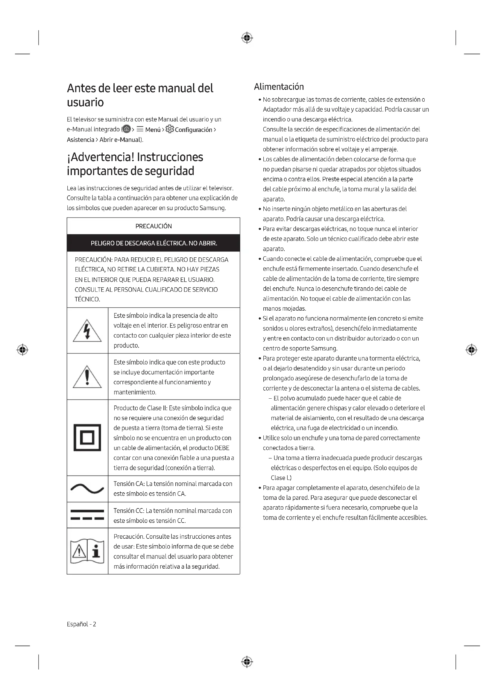 TÉCNICO. Este símbolo indica la presencia de alto voltaje en el interior. Es peligroso entrar en contacto con cualquier pieza interior de este producto. Este símbolo indica que con este producto se incluye documentación importante correspondiente al funcionamiento y mantenimiento. Producto de Clase II: Este símbolo indica que no se requiere una conexión de seguridad de puesta a tierra (toma de tierra). Si este símbolo no se encuentra en un producto con un cable de alimentación, el producto DEBE contar con una conexión fiable a una puesta a tierra de seguridad (conexión a tierra). Tensión CA: La tensión nominal marcada con este símbolo es tensión CA. Tensión CC: La tensión nominal marcada con este símbolo es tensión CC. Precaución. Consulte las instrucciones antes de usar: Este símbolo informa de que se debe consultar el manual del usuario para obtener más información relativa a la seguridad. Alimentación