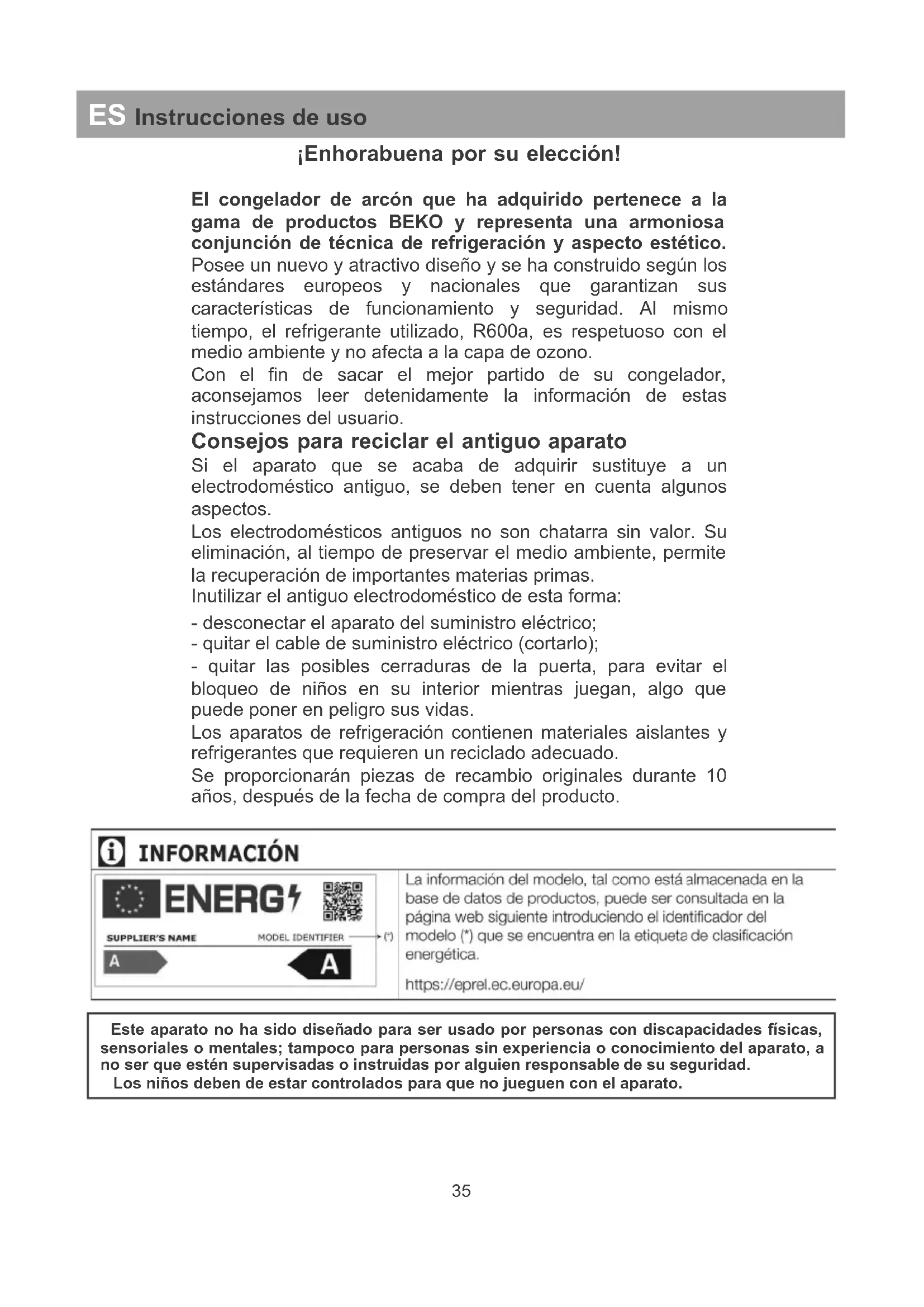 LT Naudojimo instrukcija Ant prietaiso arba pakuotės esantis simbolis nurodo, kad su šiuo prietaisu negalima elgtis kaip su buitinėmis šiukšlėmis. Jį reikia perduoti atitinkam surinkimo punktui, kad elektros ir elektronikos prietaisas būtų perdirbtas. Tinkamai išmesdami šį gaminį, prisidėsite prie apsaugos nuo galimo neigiamo poveikio aplinkai ir žmonių sveikatai, kuris gali būti padarytas šį gaminį netinkamai išmetant. Dėl išsamesnės informacijos apie šio gaminio perdirbimą, prašom kreiptis į savo miesto valdžios instituciją, buitinių atliekų išvežimo tarnybą arba parduotuvę, kurioje pirkote šį prietaisą.¡Enhorabuena por su elección! El congelador de arcón que ha adquirido pertenece a la gama de productos BEKO y representa una armoniosa conjunción de técnica de refrigeración y aspecto estético. Posee un nuevo y atractivo diseño y se ha construido según los estándares europeos y nacionales que garantizan sus características de funcionamiento y seguridad. Al mismo tiempo, el refrigerante utilizado, R600a, es respetuoso con el medio ambiente y no afecta a la capa de ozono. Con el fin de sacar el mejor partido de su congelador, aconsejamos leer detenidamente la información de estas instrucciones del usuario. Consejos para reciclar el antiguo aparato Si el aparato que se acaba de adquirir sustituye a un electrodoméstico antiguo, se deben tener en cuenta algunos aspectos. Los electrodomésticos antiguos no son chatarra sin valor. Su eliminación, al tiempo de preservar el medio ambiente, permite la recuperación de importantes materias primas. Inutilizar el antiguo electrodoméstico de esta forma: - desconectar el aparato del suministro eléctrico; - quitar el cable de suministro eléctrico (cortarlo); - quitar las posibles cerraduras de la puerta, para evitar el bloqueo de niños en su interior mientras juegan, algo que puede poner en peligro sus vidas. Los aparatos de refrigeración contienen materiales aislantes y refrigerantes que requieren un reciclado adecuado. Se proporcionarán piezas de recambio originales durante 10 años, después de la fecha de compra del producto.