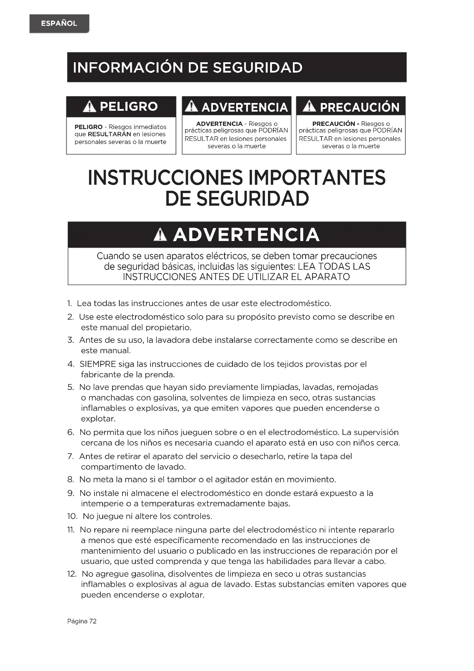 - No lave prendas que hayan sido previamente limpiadas, lavadas, remojadas o manchadas con gasolina, solventes de limpieza en seco, otras sustancias inflamables o explosivas, ya que emiten vapores que pueden encenderse o explotar.