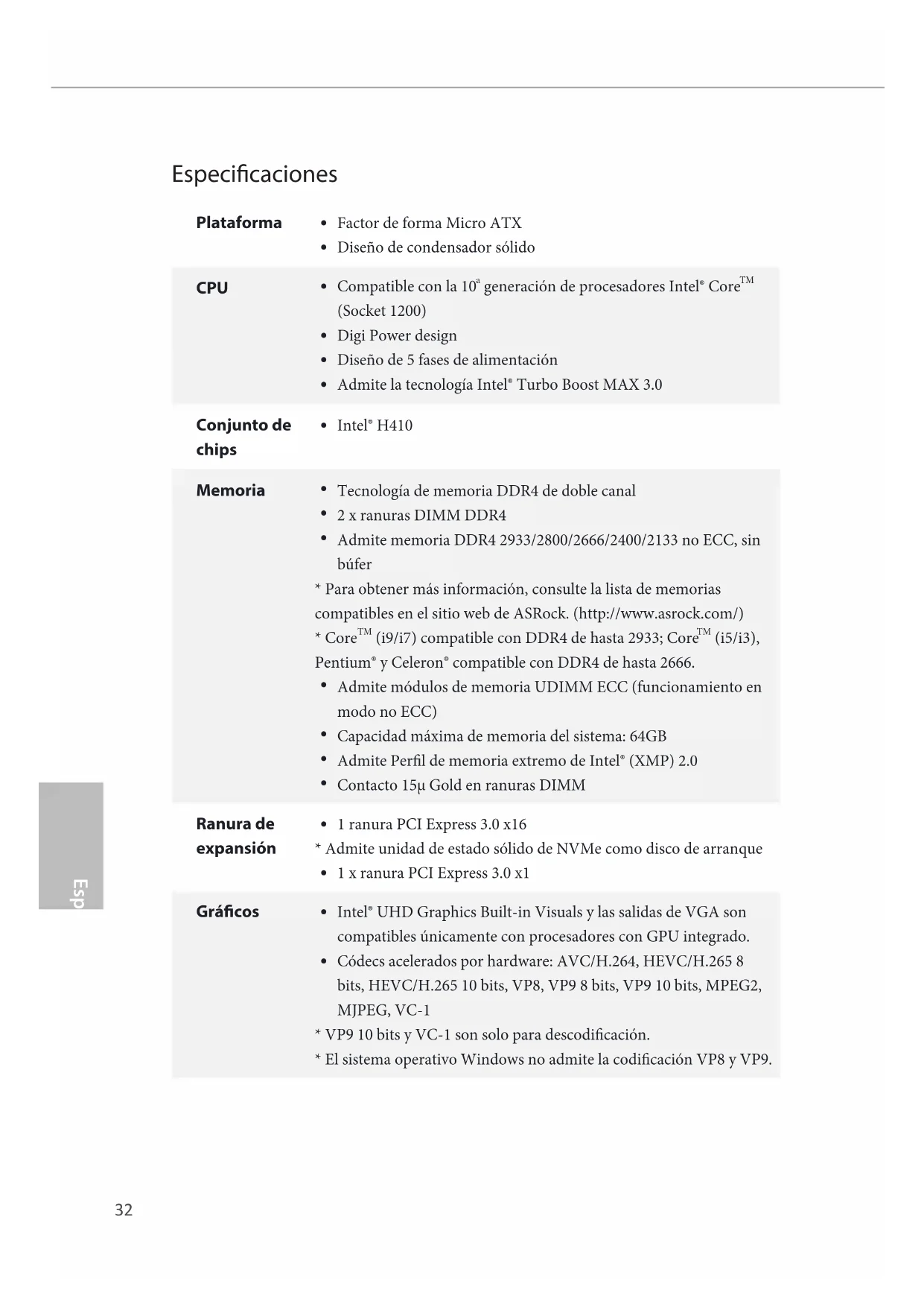 Seguridad de visualización y contenido: Rec. 2020 (gama de colores amplia), Microso PlayReady 3.0, protección de contenido Intel® SGX, disco Blu-ray UHD/HDR H410M-HDV R2.0: