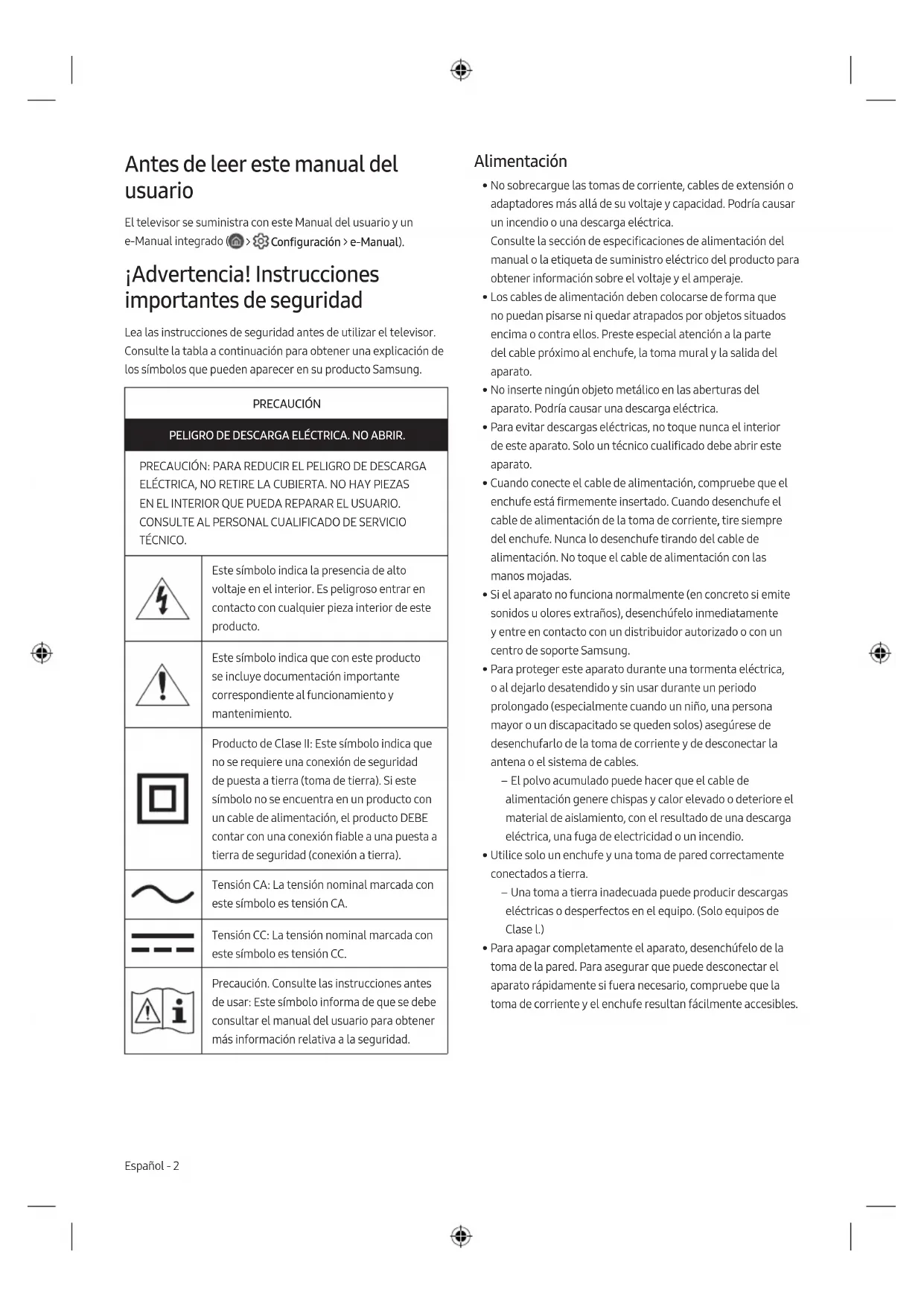 TÉCNICO. Este símbolo indica la presencia de alto voltaje en el interior. Es peligroso entrar en contacto con cualquier pieza interior de este producto. Este símbolo indica que con este producto se incluye documentación importante correspondiente al funcionamiento y mantenimiento. Producto de Clase II: Este símbolo indica que no se requiere una conexión de seguridad de puesta a tierra (toma de tierra). Si este símbolo no se encuentra en un producto con un cable de alimentación, el producto DEBE contar con una conexión fiable a una puesta a tierra de seguridad (conexión a tierra). Tensión CA: La tensión nominal marcada con este símbolo es tensión CA. Tensión CC: La tensión nominal marcada con este símbolo es tensión CC. Precaución. Consulte las instrucciones antes de usar: Este símbolo informa de que se debe consultar el manual del usuario para obtener más información relativa a la seguridad. Alimentación