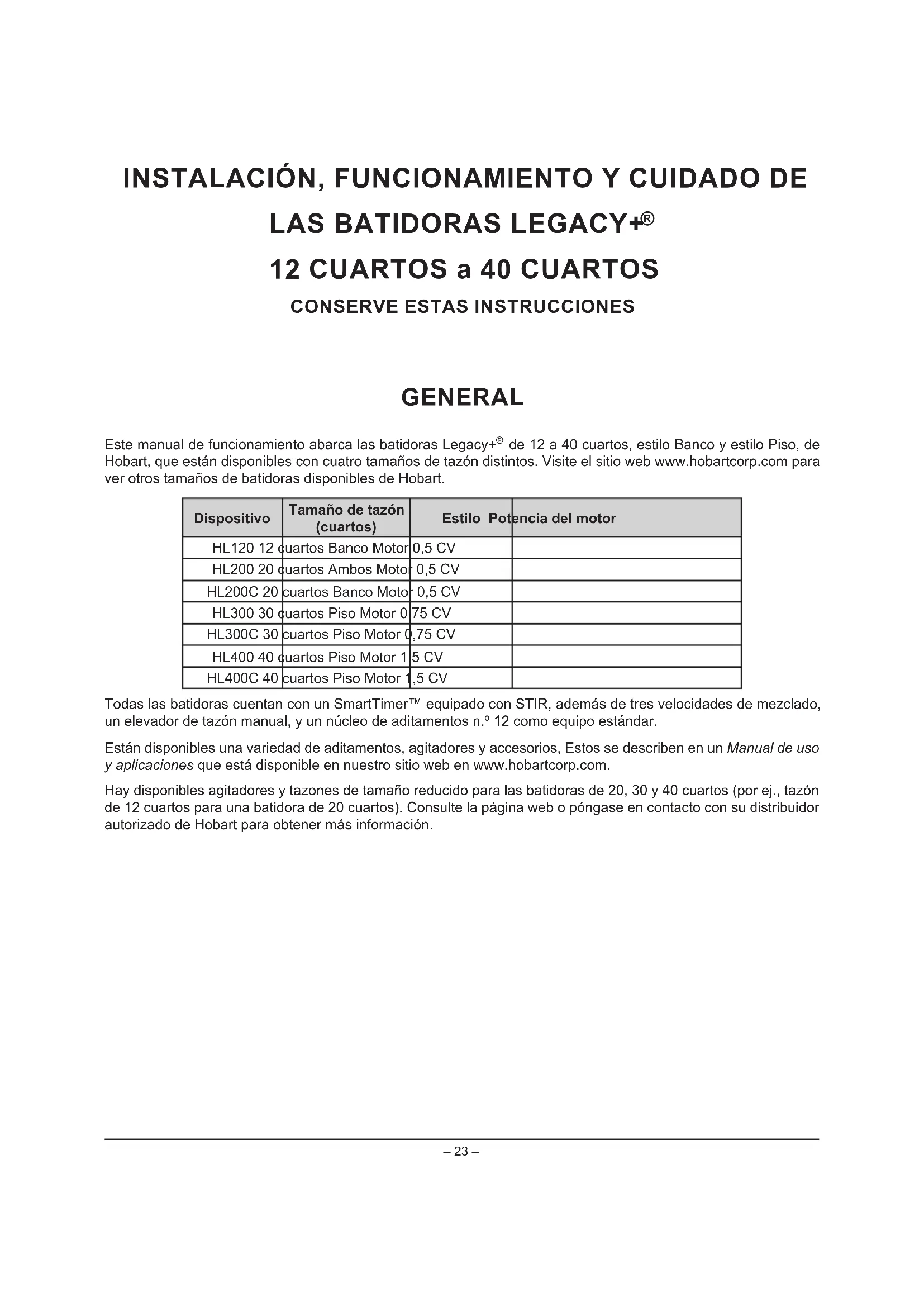 Este manual de funciona abarca las batidoras Legacy+ de 12 a 40 cuartos, estilo Banco y estilo Piso, de Hobart, que está disponible con cinco tamanos de時間 distinctos. Visite el situ web www.hobartcorp.com para ver algunos tamanos de batidoras disponibles de Hobart.