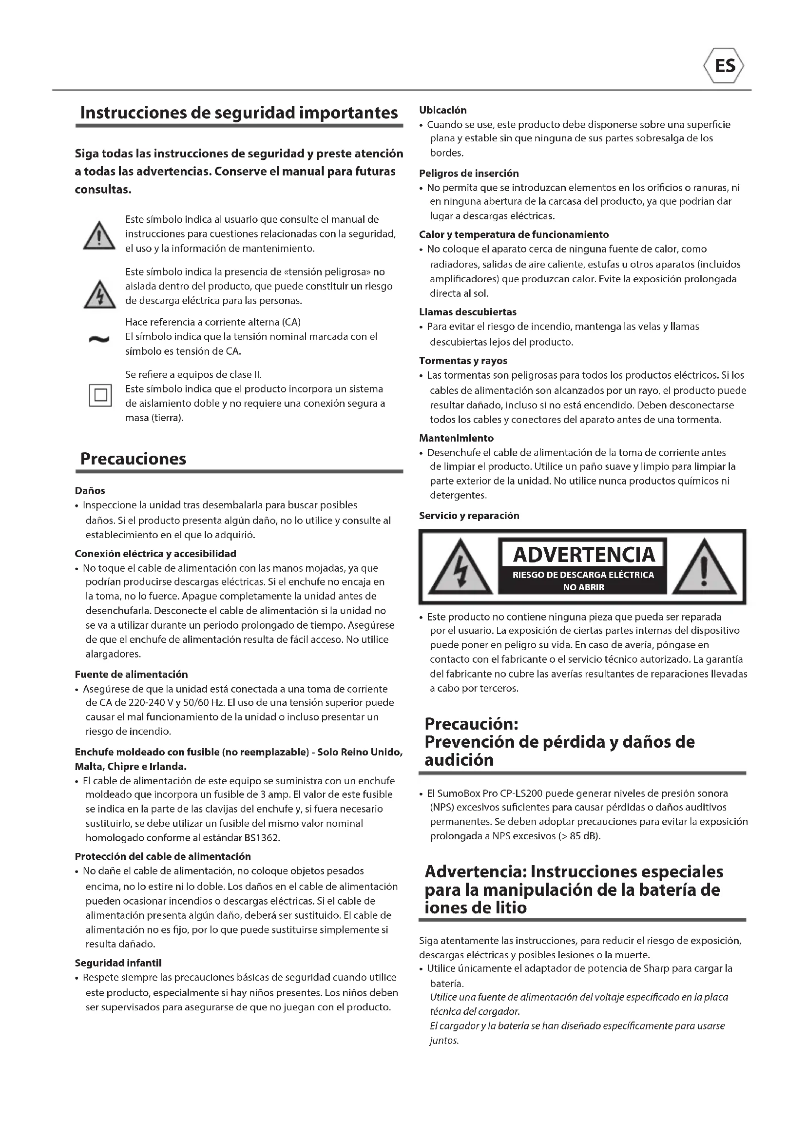 - El SumoBox Pro CP-LS200 puede generar niveles de presión sonora (NPS) excesivos sucientes para causar pérdidas o daños auditivos permanentes. Se deben adoptar precauciones para evitar la exposición prolongada a NPS excesivos (>85dB). Advertencia: Instrucciones especiales para la manipulación de la batería de iones de litio Siga atentamente las instrucciones, para reducir el riesgo de exposición, descargas eléctricas y posibles lesiones o la muerte.• Utilice únicamente el adaptador de potencia de Sharp para cargar la batería.Utilice una fuente de alimentación del voltaje especicado en la placa técnica del cargador.El cargador y la batería se han diseñado especícamente para usarse juntos. CAUTION
