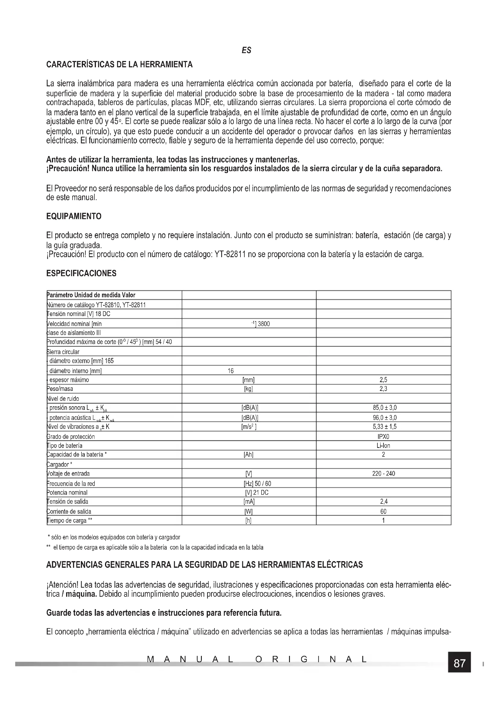 . El corte se puede realizar sólo a lo largo de una línea recta. No hacer el corte a lo largo de la curva (por ejemplo, un círculo), ya que esto puede conducir a un accidente del operador o provocar daños en las sierras y herramientas eléctricas. El funcionamiento correcto, fi able y seguro de la herramienta depende del uso correcto, porque: Antes de utilizar la herramienta, lea todas las instrucciones y mantenerlas. ¡Precaución! Nunca utilice la herramienta sin los resguardos instalados de la sierra circular y de la cuña separadora. El Proveedor no será responsable de los daños producidos por el incumplimiento de las normas de seguridad y recomendaciones de este manual. EQUIPAMIENTO El producto se entrega completo y no requiere instalación. Junto con el producto se suministran: batería, estación (de carga) y la guía graduada. ¡Precaución! El producto con el número de catálogo: YT-82811 no se proporciona con la batería y la estación de carga. ESPECIFICACIONES Parámetro Unidad de medida Valor Número de catálogo YT-82810, YT-82811 Tensión nominal [V] 18 DC Velocidad nominal [min