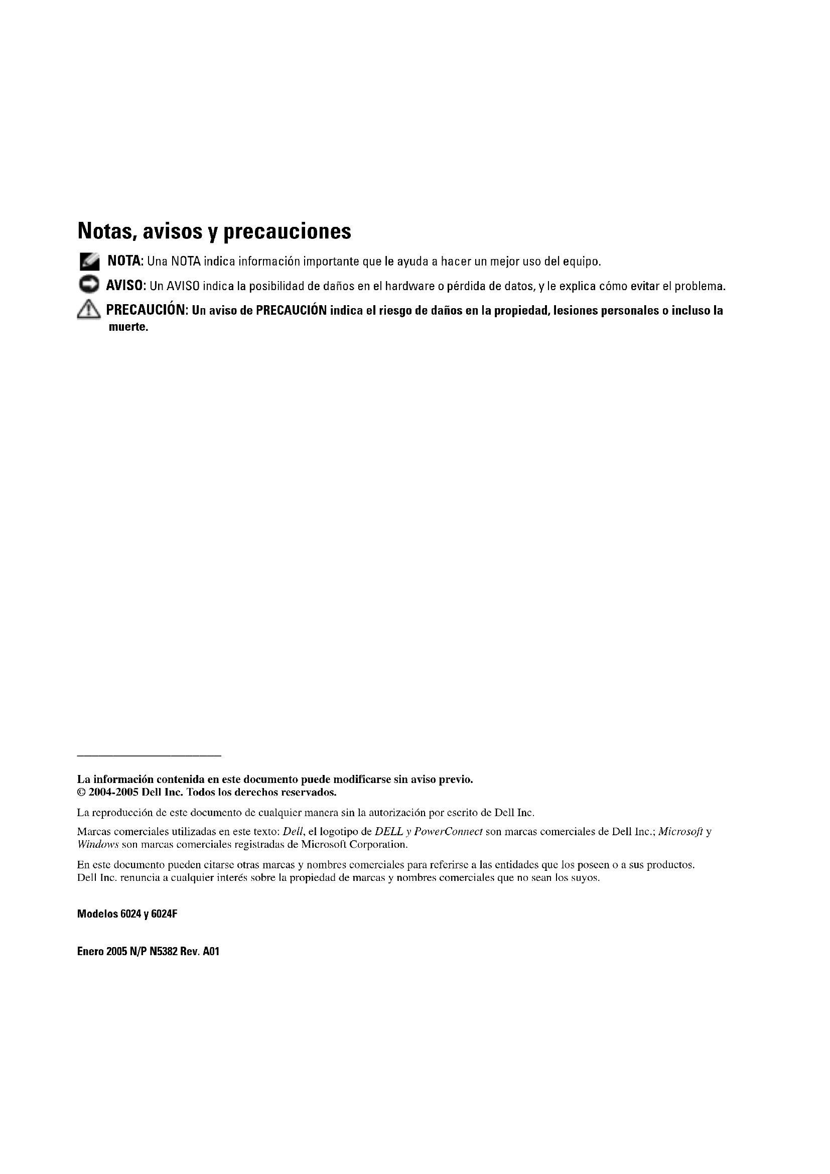 La información contenida en este documento puede modificarse sin aviso previo. © 2004-2005 Dell Inc. Todos los derechos reservados. La reproducción de este documento de cualquier manera sin la autorización por escrito de Dell Inc. Marcas comerciales utilizadas en este texto: Dell, el logotipo de DELL y PowerConnect son marcas comerciales de Dell Inc.; Microsoft y Windows son marcas comerciales registradas de Microsoft Corporation. En este documento pueden citarse otras marcas y nombres comerciales para referirse a las entidades que los poseen o a sus productos. Dell Inc. renuncia a cualquier interés sobre la propiedad de marcas y nombres comerciales que no sean los suyos. Modelos 6024 y 6024F Enero 2005 N/P N5382 Rev. A01Guía de introducción 123 Instalación Visión general En este documento se proporciona información básica para instalar, configurar y poner en funcionamiento los sistemas Dell™ PowerConnect™ 6024 y 6024F. Para obtener más información, consulte la Guía del usuario , que está disponible en el CD de documentación del usuario , o visite el sitio web Dell Support en support.dell.com para obtener las últimas actualizaciones de la documentación y el software. Preparación del emplazamiento Los dispositivos PowerConnect 60
