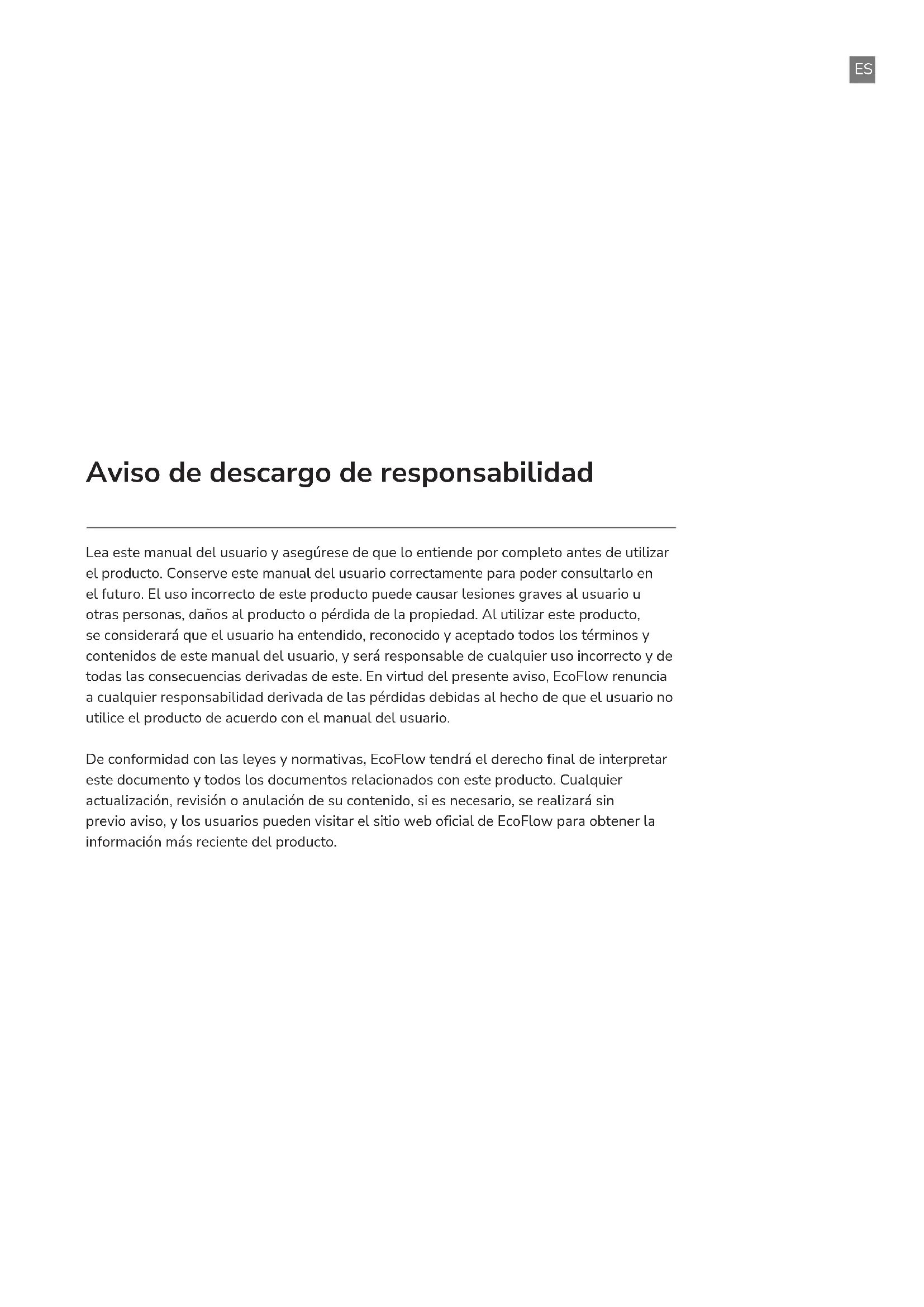 8.ES Lea este manual del usuario y asegúrese de que lo entiende por completo antes de utilizar el producto. Conserve este manual del usuario correctamente para poder consultarlo en el futuro. El uso incorrecto de este producto puede causar lesiones graves al usuario u otras personas, daños al producto o pérdida de la propiedad. Al utilizar este producto, se considerará que el usuario ha entendido, reconocido y aceptado todos los términos y contenidos de este manual del usuario, y será responsable de cualquier uso incorrecto y de todas las consecuencias derivadas de este. En virtud del presente aviso, EcoFlow renuncia a cualquier responsabilidad derivada de las pérdidas debidas al hecho de que el usuario no utilice el producto de acuerdo con el manual del usuario. De conformidad con las leyes y normativas, EcoFlow tendrá el derecho final de interpretar este documento y todos los documentos relacionados con este producto. Cualquier actualización, revisión o anulación de su contenido, si es necesario, se realizará sin previo aviso, y los usuarios pueden visitar el sitio web oficial de EcoFlow para obtener la información más reciente del producto. Aviso de descargo de responsabilidad1