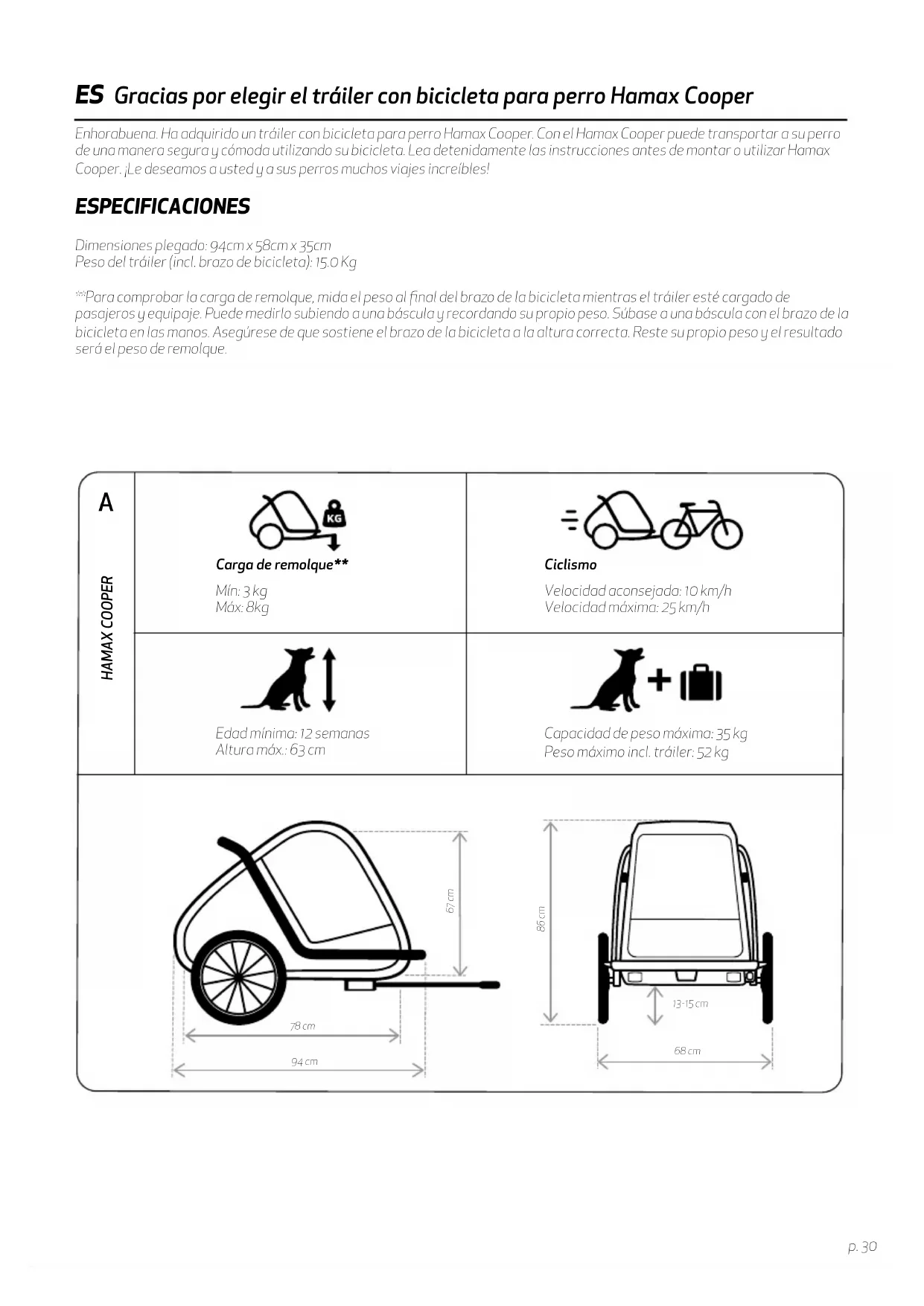 Enhorabuena. Ha adquirido un trdiler con bicicleta para perro Hamax Cooper. Con el Hamax Cooper能把 transporte a su perro de una manera segura y coma:utilizing su bicicleta. Lea detenidamente las instrucciones antes de montar outilizar Hamax Cooper, Ie desamos austed y a sus perros muchos viqes increlles!