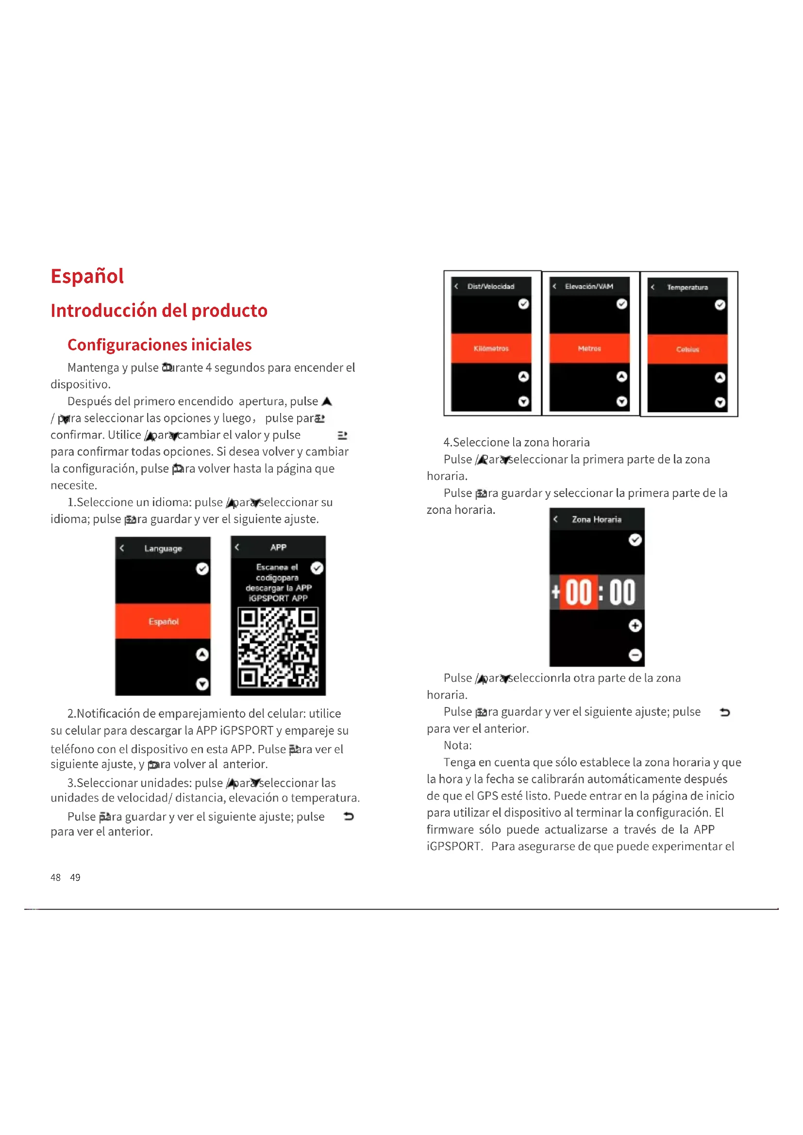 Tenga enIELD que solo establece la zona horaria y que la hora y la Fecha se calibraran automatistically afteres de que el GPS este lista. Puedeentar en la pagina de inicio para utiliser el dispositivo al terminar la configuracion. El firmware solo puedaactualizarase atravésde la APP iGPSPORT. Para asegurarse de que pueda experimentar el