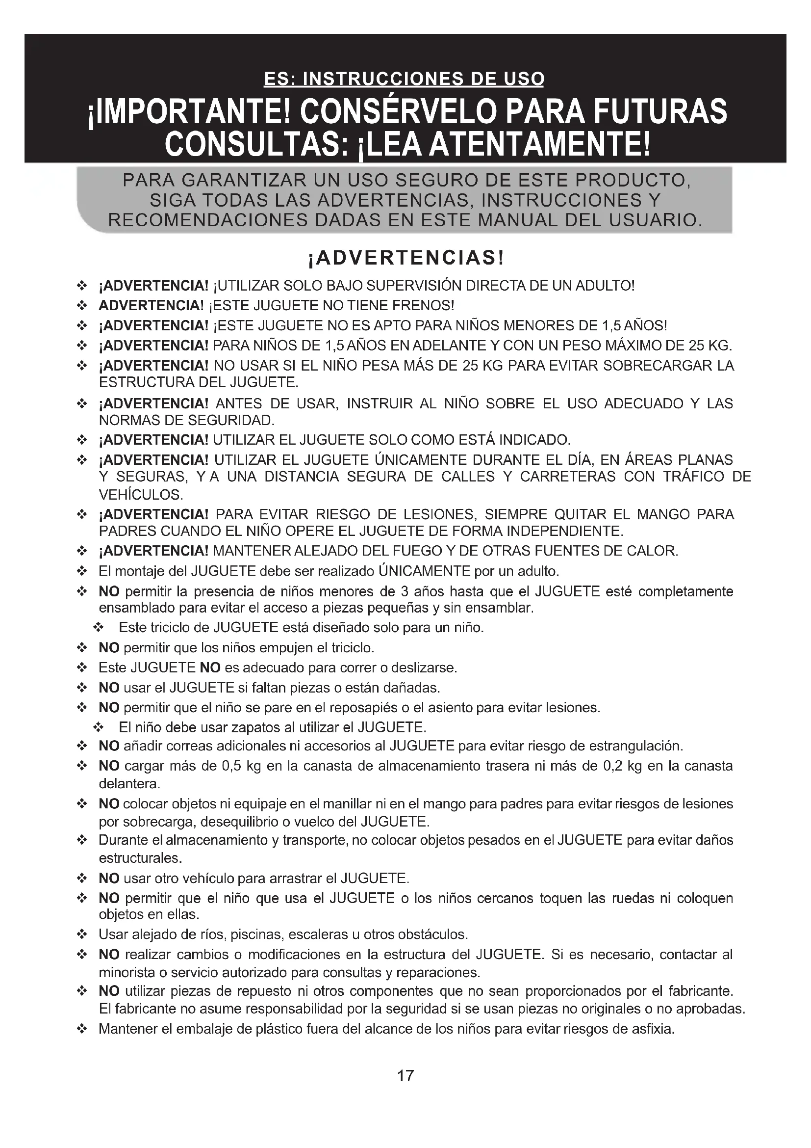 ATENCION! RETIRE EL ASA PARENTAL SOLO CUANDO ESTE SEGULO DE QUE EL NINO PUEDE CONDICIR EL TRICICLO DE FORMA INDEPENDIENTE.
