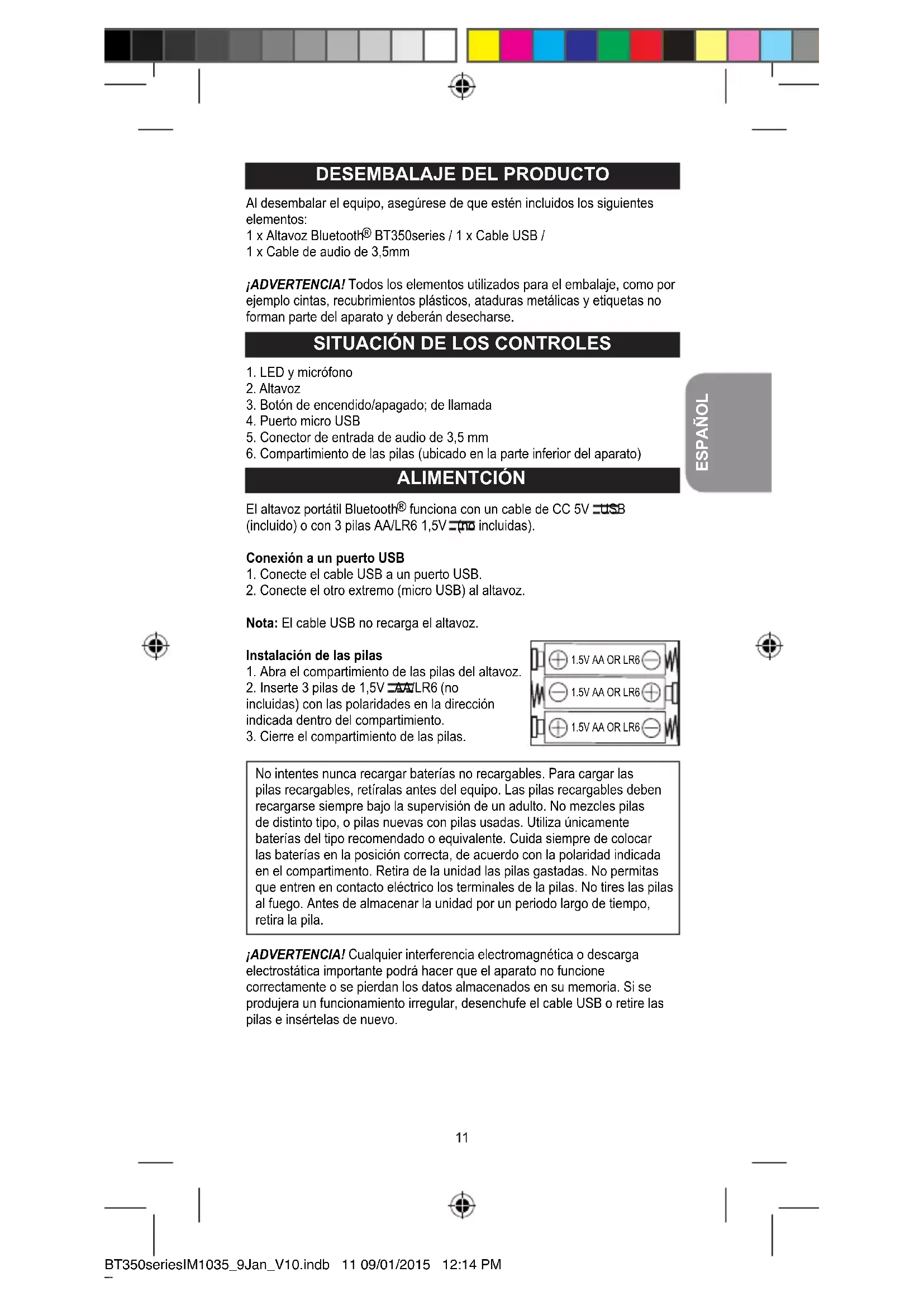No intentes nunca recargar baterías no recargables. Para cargar las pilas recargables, retíralas antes del equipo. Las pilas recargables deben recargarse siempre bajo la supervisión de un adulto. No mezcles pilas de distinto tipo, o pilas nuevas con pilas usadas. Utiliza únicamente baterías del tipo recomendado o equivalente. Cuida siempre de colocar las baterías en la posición correcta, de acuerdo con la polaridad indicada en el compartimento. Retira de la unidad las pilas gastadas. No permitas que entren en contacto eléctrico los terminales de la pilas. No tires las pilas al fuego. Antes de almacenar la unidad por un periodo largo de tiempo, retira la pila. ¡ADVERTENCIA! Cualquier interferencia electromagnética o descarga electrostática importante podrá hacer que el aparato no funcione correctamente o se pierdan los datos almacenados en su memoria. Si se produjera un funcionamiento irregular, desenchufe el cable USB o retire las pilas e insértelas de nuevo.