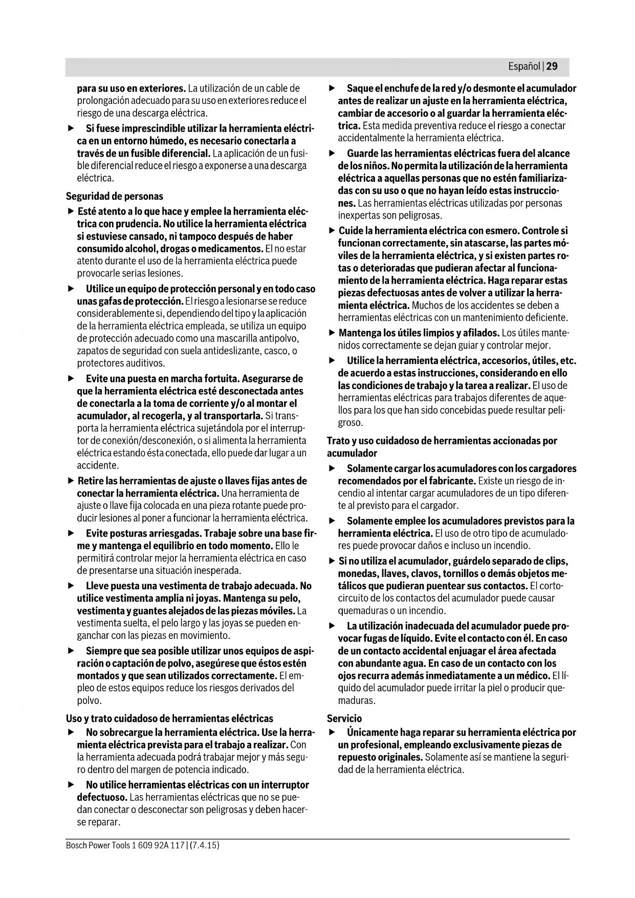 - según el acumulador utilizado ** potencia limitada a temperaturas <0 °C Datos técnicos determinados con el tipo de acumulador suministrado. Henk Becker Executive Vice President Engineering Helmut Heinzelmann Head of Product Certification PT/ETM9 OBJ_BUCH-1808-002.book Page 31 Tuesday, April 7, 2015 4:33 PM32 | Español 1 609 92A 117 | (7.4.15) Bosch Power Tools Indicador del estado de carga del acumulador El nivel de carga del acumulador 5 se señaliza mediante los tres LED verdes del indicador de carga 6. Por motivos de se- guridad, solamente es posible determinar el estado de carga con la herramienta eléctrica detenida. Pulse la tecla 7 para visualizar el estado de carga. Ello puede realizarse también con el acumulador 5 desmontado. Si al pulsar la tecla 7 no se ilumina ningún LED, ello es señal de que el acumulador está deteriorado y deberá reemplazarse. Cambio de útil Desmonte el acumulador antes de manipular en la herramienta eléctrica (p.ej. en el mantenimiento, cam- bio de útil, etc.), así como al transportarla y guardarla. En caso contrario podría accidentarse al accionar fortuita- mente el interruptor de conexión/desconexión. Utilice unos guantes de protección al cambiar de útil. Podría accidentarse en caso de tocar los útiles. Selección del útil Montaje/cambio del útil Si procede, retire primero el útil que esté montado. Abra para ello la palanca SDS 8 hasta el tope nada más (sin forzarla) y retire el útil. Coloque el útil deseado (p. ej. la hoja de sierra de inmersión
