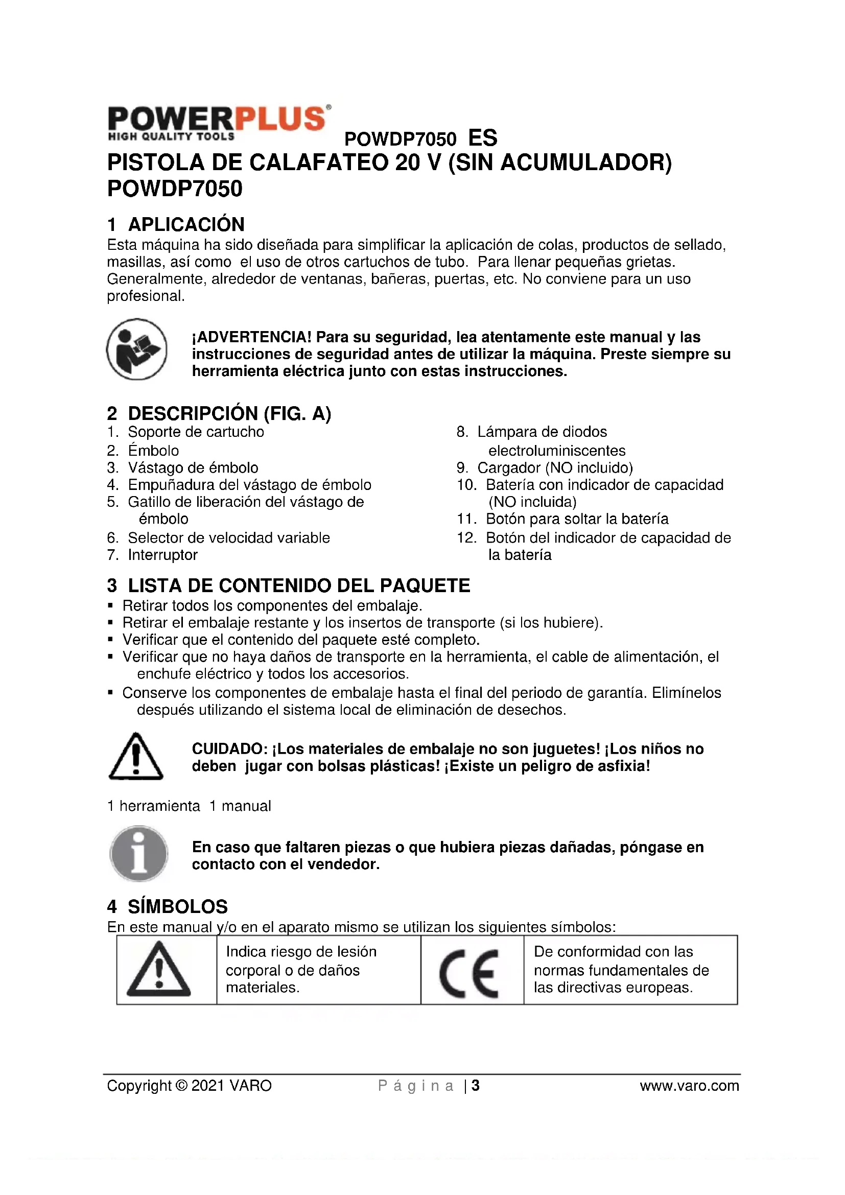 Copyright © 2021 VARO P á g i n a | 3 www.varo.com PISTOLA DE CALAFATEO 20 V (SIN ACUMULADOR) POWDP7050 1 APLICACIÓN Esta máquina ha sido diseñada para simplificar la aplicación de colas, productos de sellado, masillas, así como el uso de otros cartuchos de tubo. Para llenar pequeñas grietas. Generalmente, alrededor de ventanas, bañeras, puertas, etc. No conviene para un uso profesional. ¡ADVERTENCIA! Para su seguridad, lea atentamente este manual y las instrucciones de seguridad antes de utilizar la máquina. Preste siempre su herramienta eléctrica junto con estas instrucciones. 2 DESCRIPCIÓN (FIG. A)
