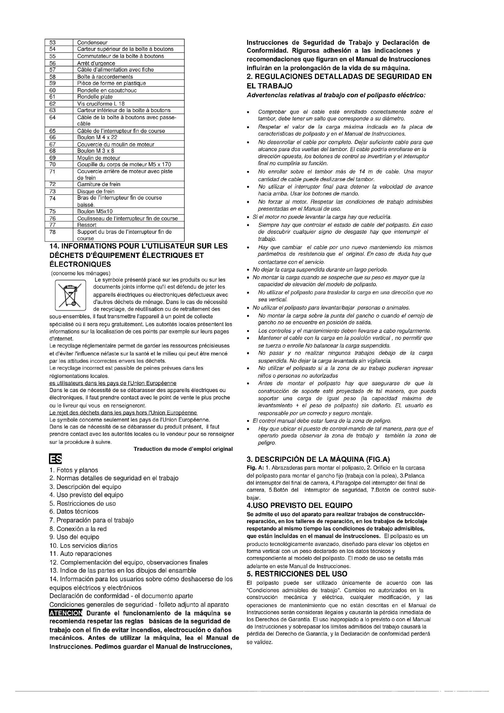 Se admite el uso del aparato para realizar trabajos de construcción- reparación, en los talleres de reparación, en los trabajos de bricolaje respetando al mismo tiempo las condiciones de trabajo admisibles, que están incluidas en el manual de instrucciones. El polipasto es un producto tecnológicamente avanzado, diseñado para elevar los objetos en forma vertical con un peso declarado en los datos técnicos y correspondiente al modelo del polipasto. El modo de uso se detalla más adelante en este Manual de Instrucciones.