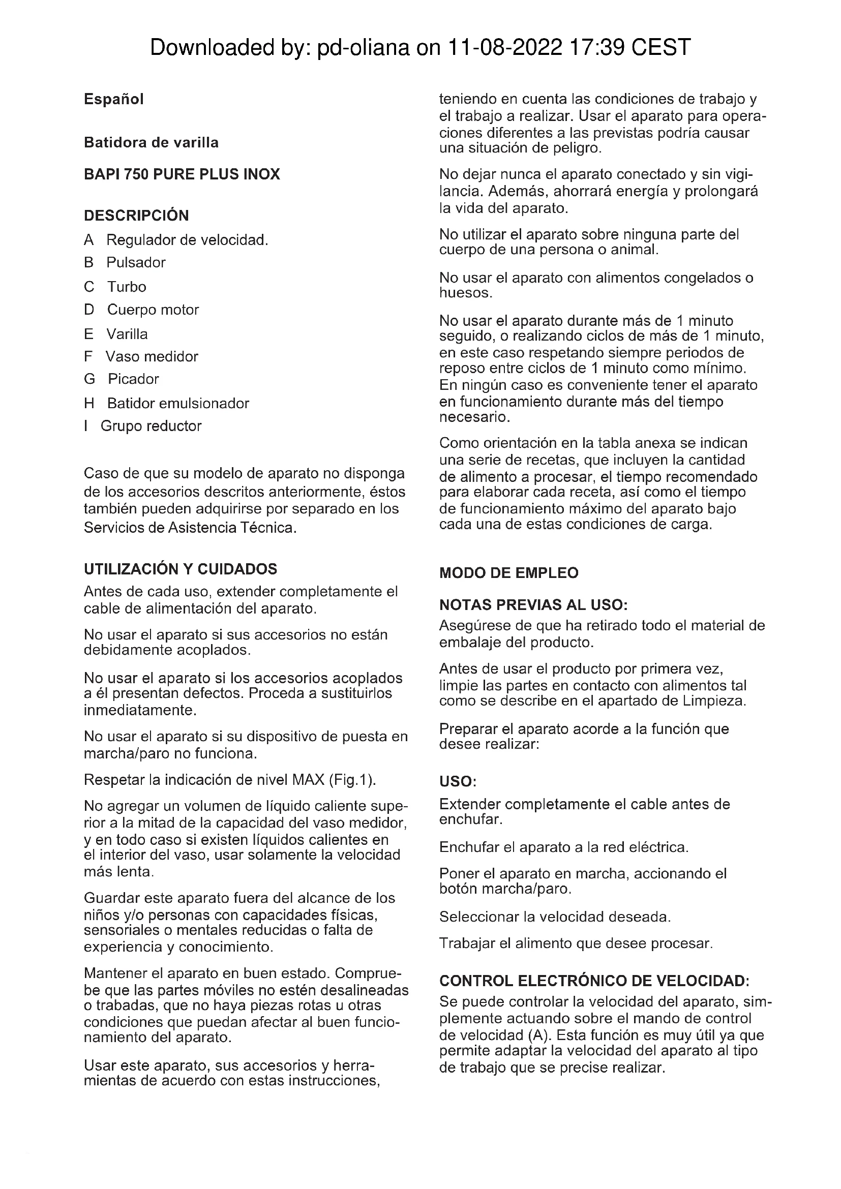 NOTAS PREVIAS AL USO: Asegúrese de que ha retirado todo el material de embalaje del producto. Antes de usar el producto por primera vez, limpie las partes en contacto con alimentos tal como se describe en el apartado de Limpieza. Preparar el aparato acorde a la función que desee realizar: USO: Extender completamente el cable antes de enchufar. Enchufar el aparato a la red eléctrica. Poner el aparato en marcha, accionando el botón marcha/paro. Seleccionar la velocidad deseada. Trabajar el alimento que desee procesar. CONTROL ELECTRÓNICO DE VELOCIDAD: Se puede controlar la velocidad del aparato, sim- plemente actuando sobre el mando de control de velocidad (A). Esta función es muy útil ya que permite adaptar la velocidad del aparato al tipo de trabajo que se precise realizar. Downloaded by: pd-oliana on 11-08-2022 17:39 CESTInsertar el batidor en el grupo reductor. Unir este conjunto al cuerpo motor girándolo en el sentido que indica la echa (Fig.4.1). En un recipiente ancho, colocar el alimento y poner en marcha el aparato. Para un óptimo resultado es conveniente mover el batidor en sentido horario. Retirar el accesorio batidor, y liberar el grupo reductor (Fig.4.2). Nota1: No trabajar a velocidades altas con este accesorio acoplado, ya que provocaría defectos sobre el batidor (centrifugación de sus alam- bres). Nota2: Para liberar batidor (H) del grupo reduc- tor (I), tire de la anilla del batidor. LIMPIEZA Desenchufar el aparato de la red y dejarlo enfriar antes de iniciar cualquier operación de limpieza. Limpiar el aparato con un paño húmedo impreg- nado con unas gotas de detergente y secarlo después. No utilizar disolventes, ni productos con un fac- tor pH ácido o básico como la lejía, ni productos abrasivos, para la limpieza del aparato. No sumergir el aparato en agua u otro líquido, ni ponerlo bajo el grifo. Durante el proceso de limpieza hay que tener especial cuidado con las cuchillas ya que están muy aladas. Se recomienda limpiar el aparato regularmente y retirar todos los restos de alimentos. Si el aparato no se mantiene en buen estado de limpieza, su supercie puede degradarse y afec- tar de forma inexorable la duración de la vida del aparato y conducir a una situación peligrosa. Las siguientes piezas son aptas para su limpieza en agua caliente jabonosa o en el lavavajillas (usando un programa suave de lavado): - Varilla - Vaso medidor - Picador - Batidor emulsionador La posición de escurrido/secado de las piezas lavables en el lavavajillas o fregadero debe per- mitir el escurrido del agua con facilidad (Fig.5). A continuación, seque todas las piezas antes de su montaje y guardado. FUNCIÓN TURBO: El aparato dispone de una función Turbo. Activando el pulsador de la función Turbo (B) se dispone de toda la potencia del motor, consi- guiendo un acabado más no en la textura nal del producto.