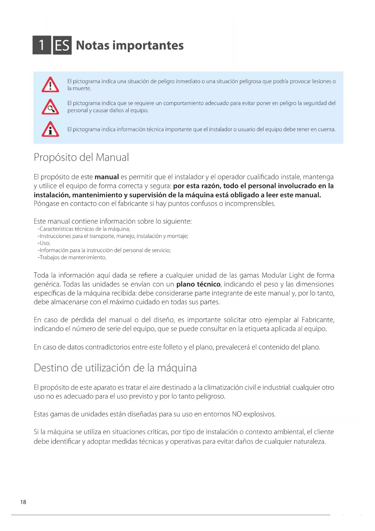 Normas de seguridad Competencias requeridas para el uso y mantenimiento de la máquina Operador genérico: HABILITADO al manejo de la máquina mediante controles situados en el panel de control. Se lleva a cabo únicamente las operaciones de control de la máquina, encendido/apagado Encargado de mantenimiento mecánico (cualificado): HABILITADO para realizar trabajos de mantenimiento, ajuste, sustitución y reparación de componentes mecánicos. Deberá ser una persona competente en sistemas mecánicos y, por lo tanto, capaz de realizar el mantenimiento mecánico de manera satisfactoria y segura; deberá poseer conocimientos teóricos y experiencia manual. NO HABILITADO para trabajar en sistemas eléctricos. Técnico de fabricante (cualificado): HABILITADO para realizar operaciones de carácter complejo en cualquier situación. Trabaja de acuerdo con el usuario. Encargado de mantenimiento eléctrico (cualificado): HABILITADO para efectuar reparaciones eléctricas, ajustes, mantenimiento y reparaciones eléctricas. HABILITADO para trabajar en la presencia de tensión en el interior de los paneles de control y cajas de conexión. Deberá ser una persona competente en electrónica e ingeniería eléctrica, y por lo tanto capaz de intervenir en sistemas eléctricos de manera satisfactoria y segura, deberá tener conocimientos teóricos y experiencia comprobada. NO HABILITADO para trabajos mecánicos. Competencias necesarias para la instalación de la máquina Los instaladores deberán llevar a cabo las operaciones de acuerdo con su cualificación profesional: todas las actividades excluidas de su competencia (por ejemplo, conexiones eléctricas) deberán ser realizadas por operadores específicos y cualificados, a fin de no poner en peligro su propia seguridad y la de otros operadores que interactúen con el equipo. Operador de transporte y manipulación de la máquina: Persona autorizada, con reconocida competencia en el uso de medios de transporte y elevación. Instalador técnico: técnico experto, enviado o autorizado por el fabricante o su representante autorizado con la competencia técnica y formación adecuadas para la instalación de la máquina. Auxiliar: técnico sujeto a tareas de cuidado durante el funcionamiento del equipo de elevación y montaje. Deberá estar debidamente formado e informado sobre las operaciones a realizar y los planes de seguridad de la obra/ instalación. Este manual especifica el técnico competente para cada operación. Los instaladores, usuarios y encargados de mantenimiento NO pueden operar en la máquina si: - carecen de experiencia o responsabilidad o son menores de edad; - presentan impedimentos físicos o un estado psicofísicas no perfecto; - no dominan el ciclo de funcionamiento de la máquina; - no han cursado una formación de preparación teórica/práctica con el apoyo de un operador o conductor de máquina experimen- tado, o con el apoyo de un técnico del fabricante. Este manual especifica el técnico competente para cada operación.20 Antes de la instalación, uso y mantenimiento de la máquina, lea atentamente este manual y guárdelo cuidadosamente para futuras consultas por parte de los distintos operadores. No quite, rasgue o reescriba partes de este manual por ninguna razón. Todas las operaciones de instalación, montaje, conexión a la red eléctrica y mantenimiento ordinario/extraordinario sólo deben ser realizadas por técnicos que cumplan los requisitos legales, después de haber desconectado el aparato eléctricamente y utilizando equipos de protección individual (p. ej., guantes, gafas protectoras, etc.), de acuerdo con las normas vigentes en el país de utilización y de acuerdo con las normas relativas a sistemas y seguridad en el trabajo. La instalación, uso o mantenimiento distintos de los indicados en el manual pueden ocasionar daños, lesiones o muerte, anular la garantía y liberar al Fabricante de cualquier responsabilidad. Durante la manipulación o instalación del aparato, es obligatorio el uso de ropa protectora y medios adecuados para prevenir accidentes y garantizar la protección de la propia seguridad y la de los demás. Durante la instalación o mantenimiento de la máquina, que no se permite el tránsito o estancia de las personas que no participan en la instalación cerca de la zona de trabajo. Antes de realizar cualquier trabajo de instalación o mantenimiento, desconecte el equipo de la fuente de alimentación. Antes de instalar el equipo, compruebe que los sistemas cumplen con la normativa vigente en el país de utilización y con lo indicado en la placa. El usuario/instalador es responsable de garantizar la estabilidad estática y dinámica de la instalación y de organizar las salas de tal forma que las personas no cualicadas y no autorizadas NO tengan acceso a la máquina o a sus mandos. El usuario/instalador es responsable de asegurar que las condiciones climáticas no comprometan la seguridad de personas y cosas durante la instalación, uso y mantenimiento. Asegúrese de que la toma de aire no esté cerca de desagües, humos de combustión u otros contaminantes. NO instale el equipo en lugares expuestos a vientos fuertes, sal, llamas libres o temperaturas superiores a 40°C (104°F). Cuando finalice la instalación, instruya al usuario para que utilice la máquina correctamente. Si el equipo no funciona o si observa cambios funcionales o estructurales, desconéctelo de la fuente de alimentación y póngase en contacto con un centro de servicio autorizado por el fabricante o distribuidor sin intentar repararlo usted mismo. Para posibles sustituciones, por favor, solicítenos únicamente piezas de recambio originales. Las intervenciones, manipulaciones o modificaciones no autorizadas expresamente que no se ajusten al contenido de este manual anularán la garantía y pueden causar daños, lesiones o accidentes, incluso mortales. La placa de la unidad proporciona una importante información técnica: es 