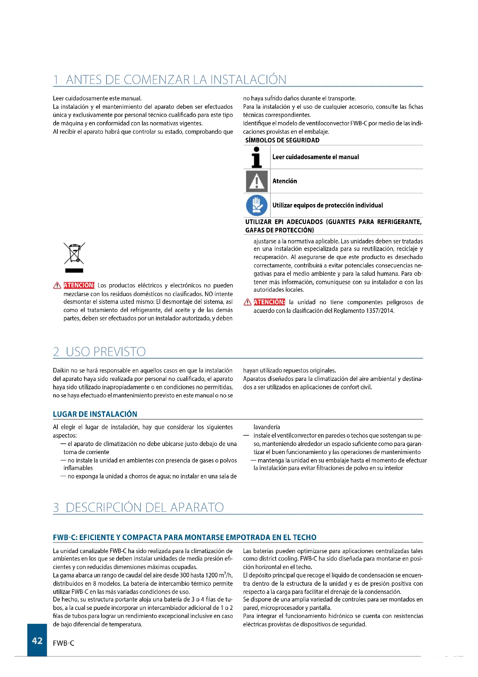 Leer cuidadosamente el manual Atención Utilizar equipos de protección individual UTILIZAR EPI ADECUADOS (GUANTES PARA REFRIGERANTE, GAFAS DE PROTECCIÓN) ATENCIÓN: Los productos eléctricos y electrónicos no pueden mezclarse con los residuos domésticos no clasicados. NO intente desmontar el sistema usted mismo: El desmontaje del sistema, así como el tratamiento del refrigerante, del aceite y de las demás partes, deben ser efectuados por un instalador autorizado, y deben ajustarse a la normativa aplicable. Las unidades deben ser tratadas en una instalación especializada para su reutilización, reciclaje y recuperación. Al asegurarse de que este producto es desechado correctamente, contribuirá a evitar potenciales consecuencias ne- gativas para el medio ambiente y para la salud humana. Para ob- tener más información, comuníquese con su instalador o con las autoridades locales. ATENCIÓN: la unidad no tiene componentes peligrosos de acuerdo con la clasicación del Reglamento 1357/2014. 2 USO PREVISTO Daikin no se hará responsable en aquellos casos en que la instalación del aparato haya sido realizada por personal no cualicado, el aparato haya sido utilizado inapropiadamente o en condiciones no permitidas, no se haya efectuado el mantenimiento previsto en este manual o no se hayan utilizado repuestos originales. Aparatos diseñados para la climatización del aire ambiental y destina- dos a ser utilizados en aplicaciones de confort civil.