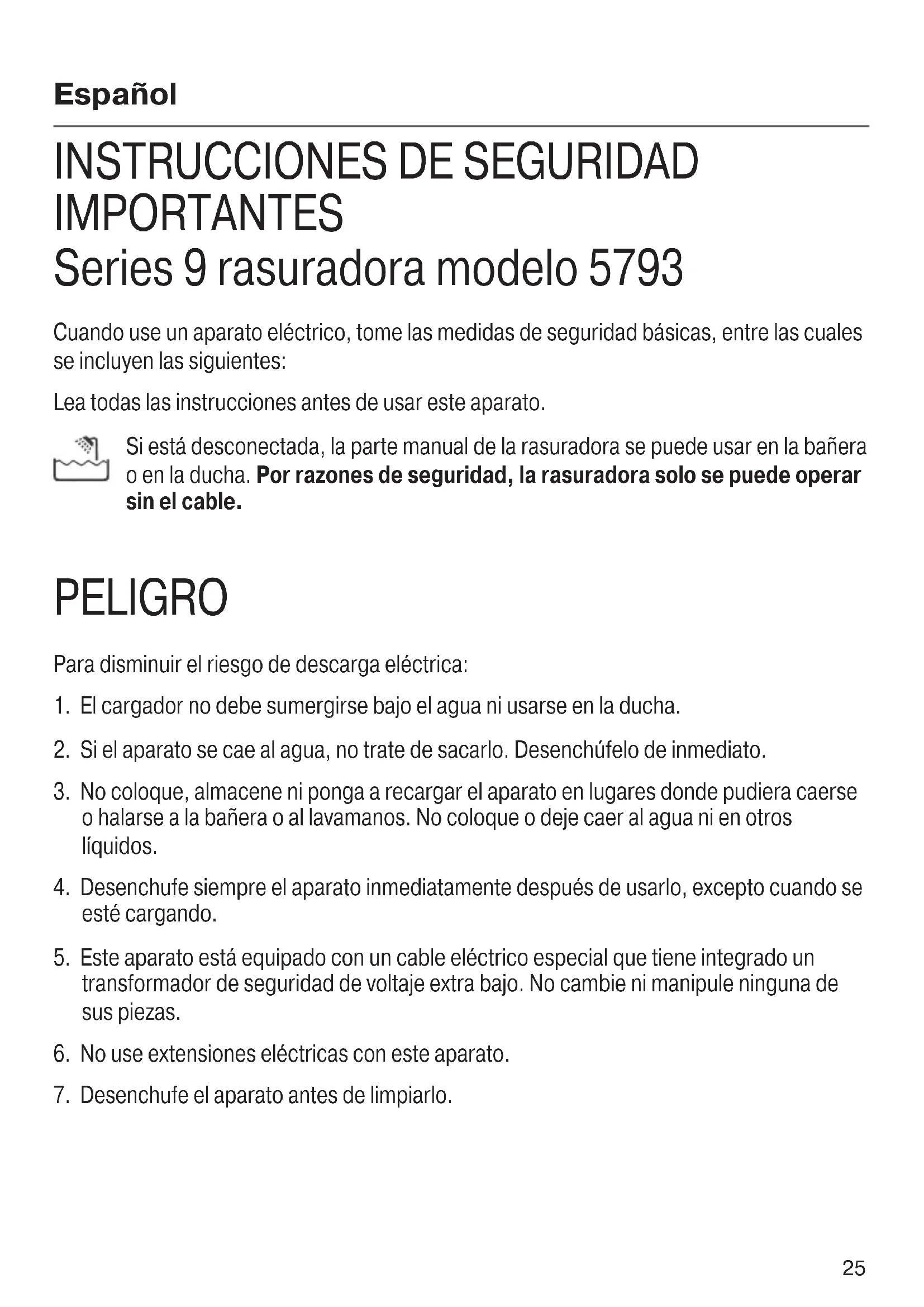 IMPORTANTES Series 9 rasuradora modelo 5793 Cuando use un aparato eléctrico, tome las medidas de seguridad básicas, entre las cuales se incluyen las siguientes: Lea todas las instrucciones antes de usar este aparato. Si está desconectada, la parte manual de la rasuradora se puede usar en la bañera o en la ducha. Por razones de seguridad, la rasuradora solo se puede operar sin el cable. PELIGRO Para disminuir el riesgo de descarga eléctrica: