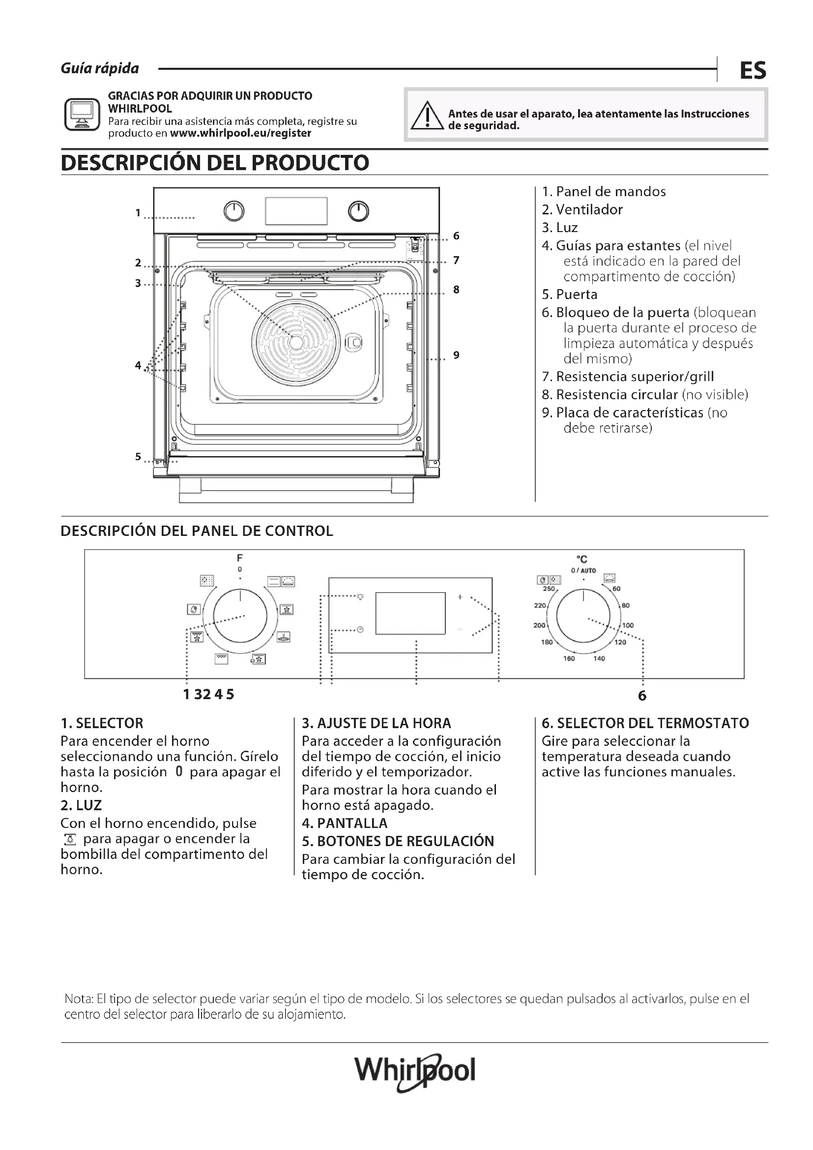 - También puede ponerse en contacto con nuestro Servicio postventa (Consulte el número de teléfono en el folleto de la garantía). Cuando se ponga en contacto con nuestro Servicio Postventa, deberá indicar los códigos que guran en la placa de características de su producto. XXXXXXXXXXXXXX Model: xxxXXXXxxFR Guide rapide MERCI D’AVOIR CHOISI UN PRODUIT WHIRLPOOLAn de proter d’une assistance complète, veuillez enregistrer votre appareil sur www . whirlpool . eu/ registerLisez attentivement les consignes de sécurité avant d’utiliser l’appareil.