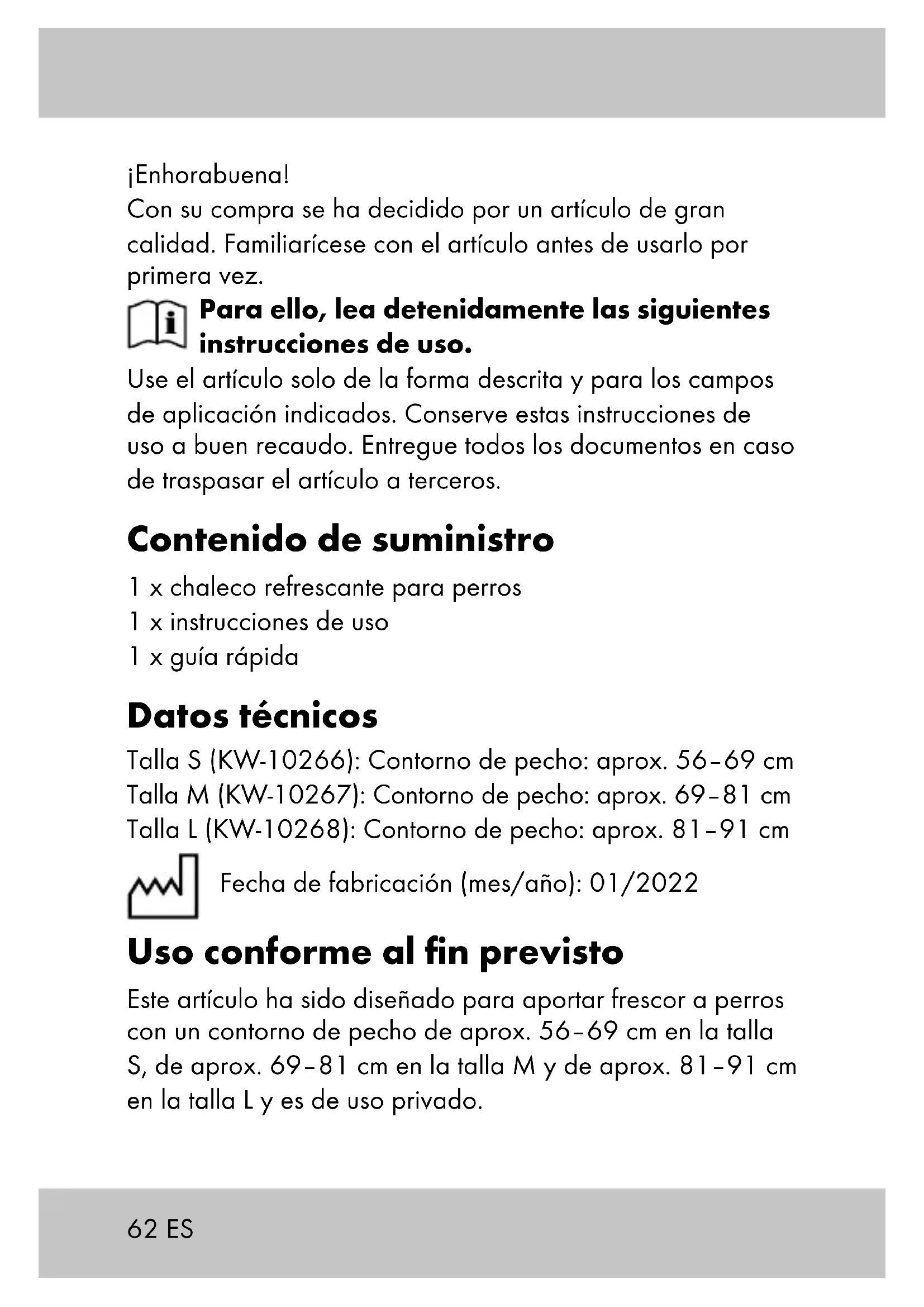 Nota: Tenga cuidado de que la distancia entre la espalda y el artículo sea de dos dedos de ancho. B67ES Almacenamiento, limpieza El artículo debe limpiarse mecánicamente con regularidad para que conserve su funcionalidad. Si no va a utilizarlo, almacene siempre el artículo seco y limpio a temperatura ambiente. Límpielo con agua si no está muy sucio y a continuación séquelo con un paño de limpieza. ¡IMPORTANTE! No lo limpie con productos de limpieza agresivos. El artículo deberá desinfectarse si su perro está enfermo o lo ha estado. Consulte a un veterinario de confianza y pídale consejo sobre artículos de higiene y desinfección adecuados. Indicaciones para la eliminación Elimine el artículo y el material de embalaje conforme a la normativa legal local en la actualidad. No deje material de embalaje, como bolsas de plástico, en manos de niños. Guarde el material de embalaje en un lugar inaccesible para éstos. Deseche los productos y embalajes de manera respetuosa con el medio ambiente. El código de reciclaje sirve para identificar diversos materiales para reincorporarlos en el ciclo de reciclaje. El código consta del símbolo de reciclaje, el cual debe reflejar el ciclo de recuperación, y de un número que identifica el material.68 Indicaciones relativas a la garantía y la gestión de servicios El artículo ha sido fabricado con gran esmero y sometido a controles constantes. Para el mismo, DELTA-SPORT HANDELSKONTOR GmbH ofrece a los clientes finales particulares una garantía de tres años a contar desde la fecha de compra (periodo de garantía) con arreglo a las condiciones que se exponen a continuación. La garantía tiene validez únicamente para fallos del material y fabricación. La garantía no cubre las piezas sometidas a un desgaste normal, las cuales se consideran piezas de desgaste (p. ej., pilas) así como tampoco piezas frágiles como, p. ej., interruptores, baterías o piezas fabricadas en vidrio o cristal. Se excluyen derechos derivados de esta garantía, si se ha realizado un uso incorrecto o abusivo del artículo o que no se encuentre dentro del marco del uso o ámbito de uso previstos o si no se ha observado lo recogido en el manual de instrucciones, a no ser que el cliente final demuestre que existen fallos del material o fabricación no derivados de una de las circunstancias expuestas anteriormente. Las demandas derivadas de la garantía sólo podrán presentarse dentro del periodo de garantía exhibiendo el comprobante de compra original. Le rogamos, por ello, que conserve el comprobante de compra original. El periodo de garantía no se verá prolongado por ningún tipo de repara- ción realizada con motivo de la garantía, la garantía legal o como gesto de buena voluntad. Esto se aplica también a las piezas sustituidas o reparadas. ES69ES Por favor, dirija sus quejas primero a la línea telefónica del servicio de atención al cliente que se indica a continuación o póngase en contacto con nosotros por correo electrónico. Si el caso está cubierto por la garantía, a nuestra elección, repararemos o cambiaremos gratuitamente el artículo o le restituiremos el precio de compra del mismo. De la garantía no se derivan otros derechos. Esta garantía no limitará sus derechos legales, especialmen- te los derechos de garantía frente al vendedor correspon- diente. IAN: 389124_2107 Servicio España Tel.: 900 984 989 E-Mail: deltasport@lidl.es70 Hjertelig tillykke! Du har valgt at købe et kvalitetsprodukt. Lær produktet at kende, inden du bruger det første gang. Det gør du ved at læse nedenstående brugervejledning omhyggeligt. Brug kun produktet som beskrevet og til de angivne anven- delsesområder. Opbevar denne brugervejledning et sikkert sted. Udlever også alle dokumenter, hvis produktet videregi- ves til en tredjepart. Leveringsomfang 1 x kølevest til hunde 1 x brugervejledning 1 x kort vejledning Tekniske data Størrelse S (KW-10266): Brystomfang: ca. 56–69 cm Størrelse M (KW-10267): Brystomfang: ca. 69–81 cm Størrelse L (KW-10268): Brystomfang: ca. 81–91 cm Fremstillingsdato (måned/år): 01/2022 DK71 Tilsigtet brug Denne artikel er designet som køleartikel til hunde med en brystomkreds på cirka 56–69 cm for str. S, cirka 69–81 cm for str. M og cirka 81–91 cm for str. L og er til privat brug. Sikkerhedsoplysninger Fare for skader!