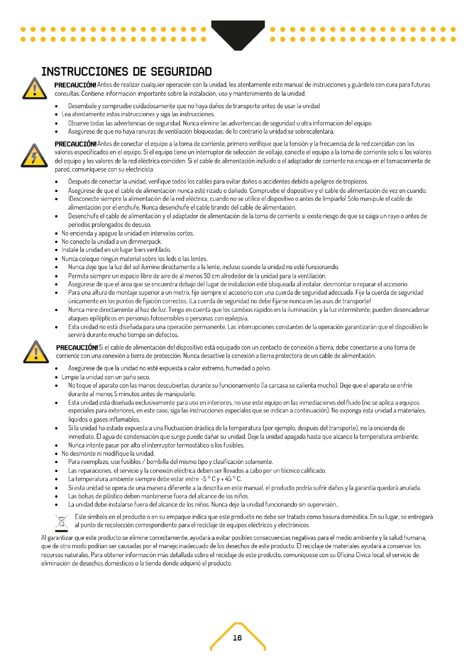 - Esta unidad no está diseñada para una operación permanente. Las interrupciones constantes de la operación garantizarán que el dispositivo le servirá durante mucho tiempo sin defectos. Si el cable de alimentación del dispositivo está equipado con un contacto de conexión a tierra, debe conectarse a una toma de corriente con una conexión a tierra de protección. Nunca desactive la conexión a tierra protectora de un cable de alimentación.