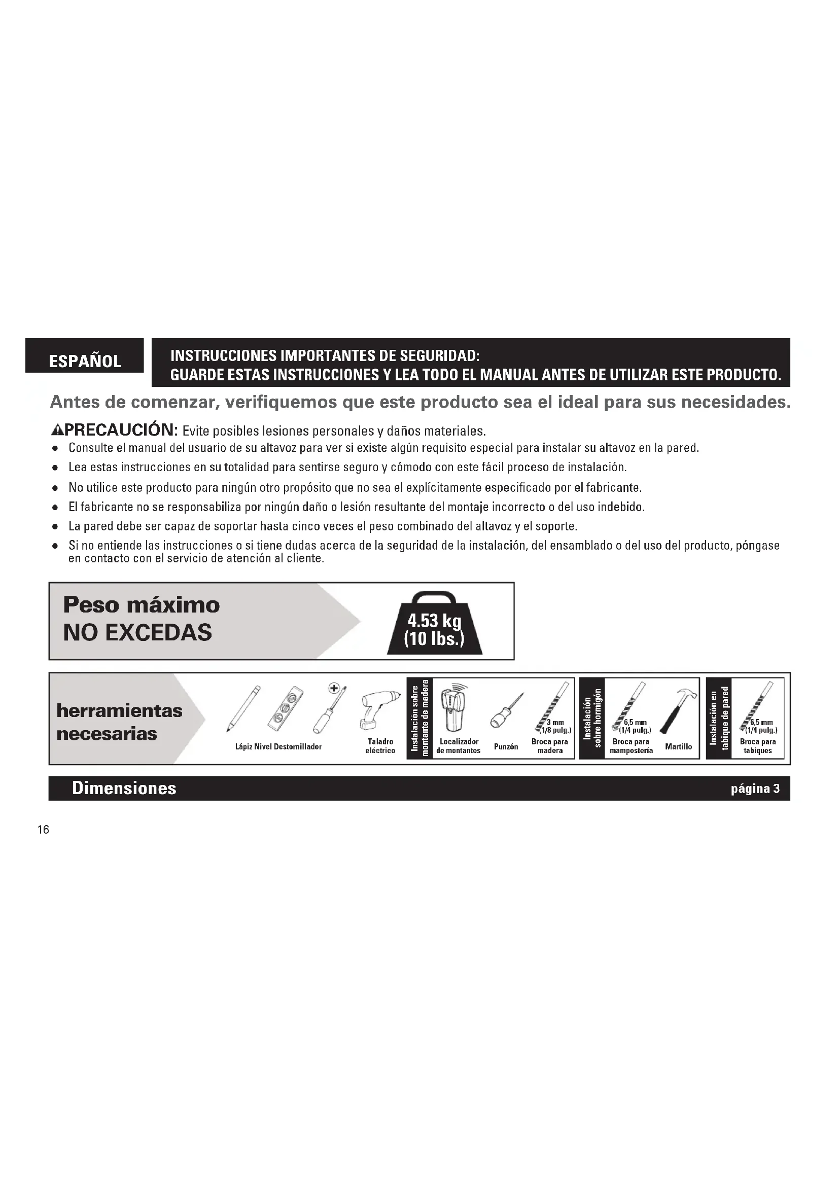 Instalación sobre montante de maderaInstalación sobre hormigónInstalación en tabique de paredLápiz Nivel DestornilladorTaladro eléctricoLocalizador de montantesPunzónBroca para maderaBroca para mamposteríaMartilloBroca para tabiques6,5 mm (1/4 pulg.)6,5 mm (1/4 pulg.) 3 mm (1/8 pulg.) ESPAÑOL INSTRUCCIONES IMPORTANTES DE SEGURIDAD: GUARDE ESTAS INSTRUCCIONES Y LEA TODO EL MANUAL ANTES DE UTILIZAR ESTE PRODUCTO. Antes de comenzar, verifiquemos que este producto sea el ideal para sus necesidades. ● Consulte el manual del usuario de su altavoz para ver si existe algún requisito especial para instalar su altavoz en la pared. ● Lea estas instrucciones en su totalidad para sentirse seguro y cómodo con este fácil proceso de instalación. ● No utilice este producto para ningún otro propósito que no sea el explícitamente especificado por el fabricante. ● El fabricante no se responsabiliza por ningún daño o lesión resultante del montaje incorrecto o del uso indebido. ● La pared debe ser capaz de soportar hasta cinco veces el peso combinado del altavoz y el soporte. ● Si no entiende las instrucciones o si tiene dudas acerca de la seguridad de la instalación, del ensamblado o del uso del producto, póngase en contacto con el servicio de atención al cliente. PRECAUCIÓN: Evite posibles lesiones personales y daños materiales.