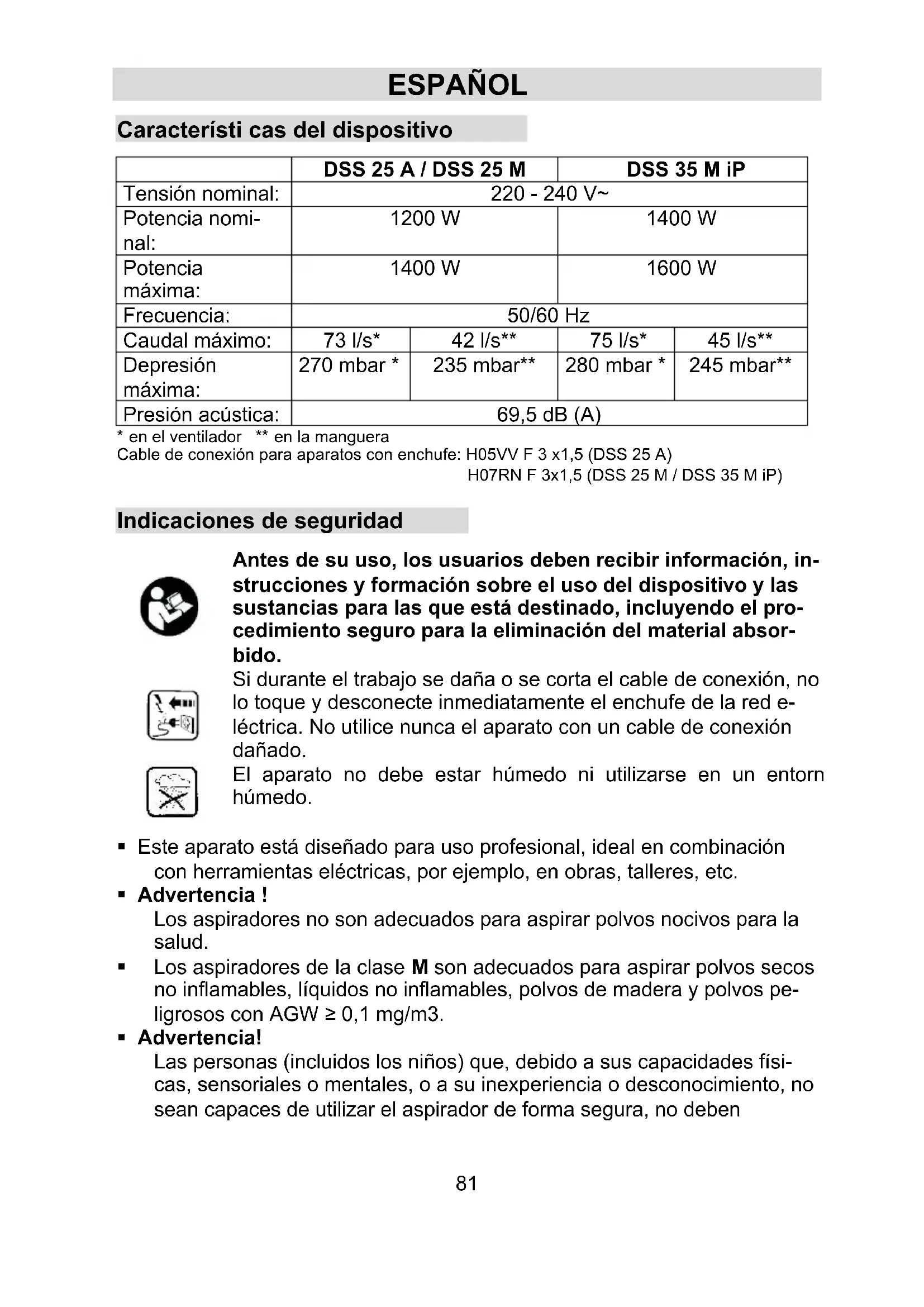 - en el ventilador ** en la manguera Cable de conexión para aparatos con enchufe: H05VV F 3 x1,5 (DSS 25 A) H07RN F 3x1,5 (DSS 25 M / DSS 35 M iP) Indicaciones de seguridad