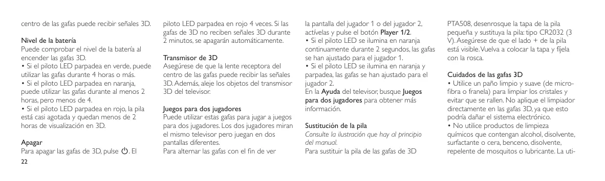 V). Asegúrese de que el lado + de la pila está visible. Vuelva a colocar la tapa y fíjela con la rosca. Cuidados de las gafas 3D • Utilice un paño limpio y suave (de microfibra o franela) para limpiar los cristales y evitar que se rallen. No aplique el limpiador directamente en las gafas 3D, ya que esto podría dañar el sistema electrónico. • No utilice productos de limpieza químicos que contengan alcohol, disolvente, surfactante o cera, benceno, disolvente, repelente de mosquitos o lubricante. La uti-