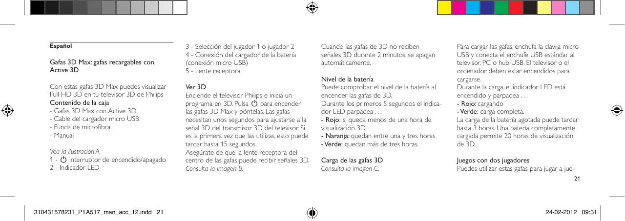 Active 3D Con estas gafas 3D Max puedes visualizar Full HD 3D en tu televisor 3D de Philips Contenido de la caja - Gafas 3D Max con Active 3D - Cable del cargador micro USB - Funda de microfibra - Manual Vea la ilustración A. 1 - A interruptor de encendido/apagado 2 - Indicador LED