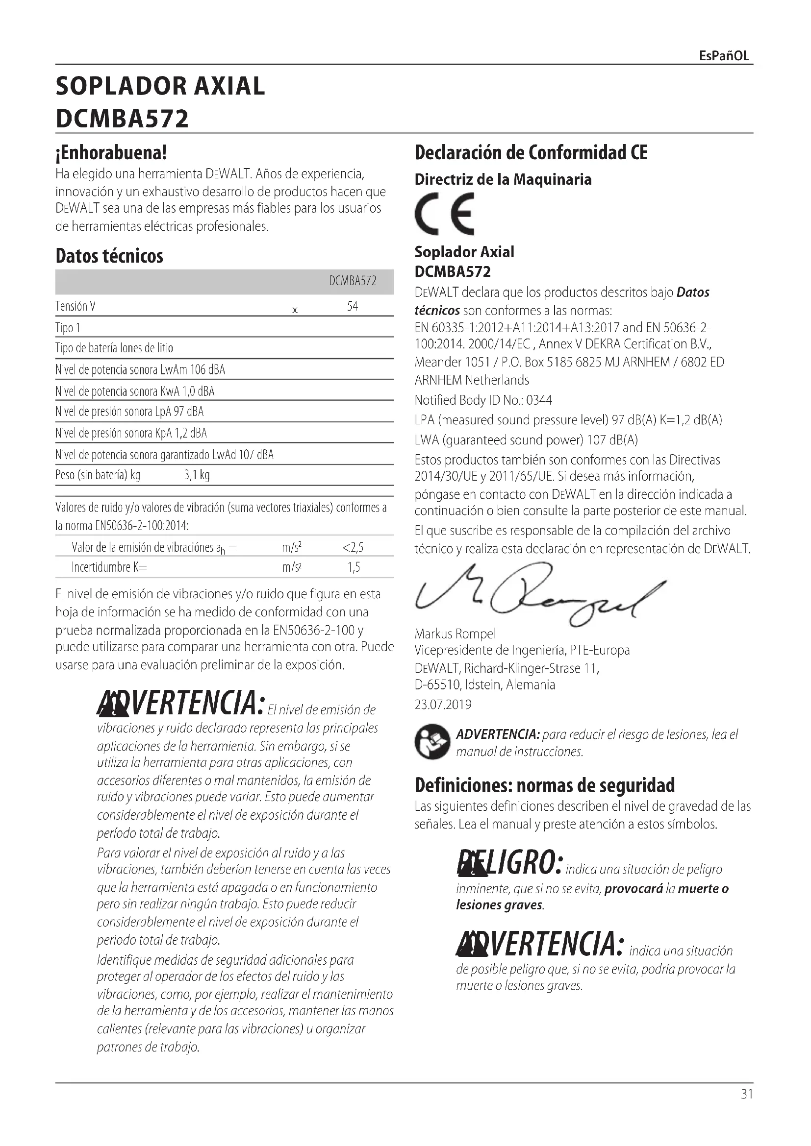 ADVERTENCIA: El nivel de emisión de vibraciones y ruido declarado representa las principales aplicaciones de la herramienta. Sin embargo, si se utiliza la herramienta para otras aplicaciones, con accesorios diferentes o mal mantenidos, la emisión de ruido y vibraciones puede variar. Esto puede aumentar considerablemente el nivel de exposición durante el período total detrabajo.Para valorar el nivel de exposición al ruido y a las vibraciones, también deberían tenerse en cuenta las veces que la herramienta está apagada o en funcionamiento pero sin realizar ningún trabajo. Esto puede reducir considerablemente el nivel de exposición durante el periodo total detrabajo.Identifique medidas de seguridad adicionales para proteger al operador de los efectos del ruido y las vibraciones, como, por ejemplo, realizar el mantenimiento de la herramienta y de los accesorios, mantener las manos calientes (relevante para las vibraciones) u organizar patrones detrabajo. Declaración de Conformidad CE Directriz de la Maquinaria Soplador Axial DCMBA572 DeWALT declara que los productos descritos bajo Datos técnicos son conformes a las normas: EN 60335-1:2012+A11:2014+A13:2017 and EN 50636-2-100:2014. 2000/14/EC , Annex V DEKRA Certification B.V., Meander 1051 / P.O. Box 5185 6825 MJ ARNHEM / 6802 ED ARNHEM Netherlands Notified Body ID No.: 0344 LPA (measured sound pressure level) 97 dB(A) K=1,2 dB(A)LWA (guaranteed sound power) 107 dB(A)Estos productos también son conformes con las Directivas 2014/30/UE y 2011/65/UE. Si desea más información, póngase en contacto con DeWALT en la dirección indicada a continuación o bien consulte la parte posterior de estemanual.El que suscribe es responsable de la compilación del archivo técnico y realiza esta declaración en representación deDeWALT.Markus Rompel Vicepresidente de Ingeniería, PTE-Europa DeWALT, Richard-Klinger-Strase 11, D-65510, Idstein, Alemania23.07.2019Español (traducido de las instrucciones originales) ¡Enhorabuena! Ha elegido una herramienta DeWALT. Años de experiencia, innovación y un exhaustivo desarrollo de productos hacen que DeWALT sea una de las empresas más fiables para los usuarios de herramientas eléctricasprofesionales. Datos técnicos SOPLADOR AXIAL DCMBA572 DCMBA572Tensión V