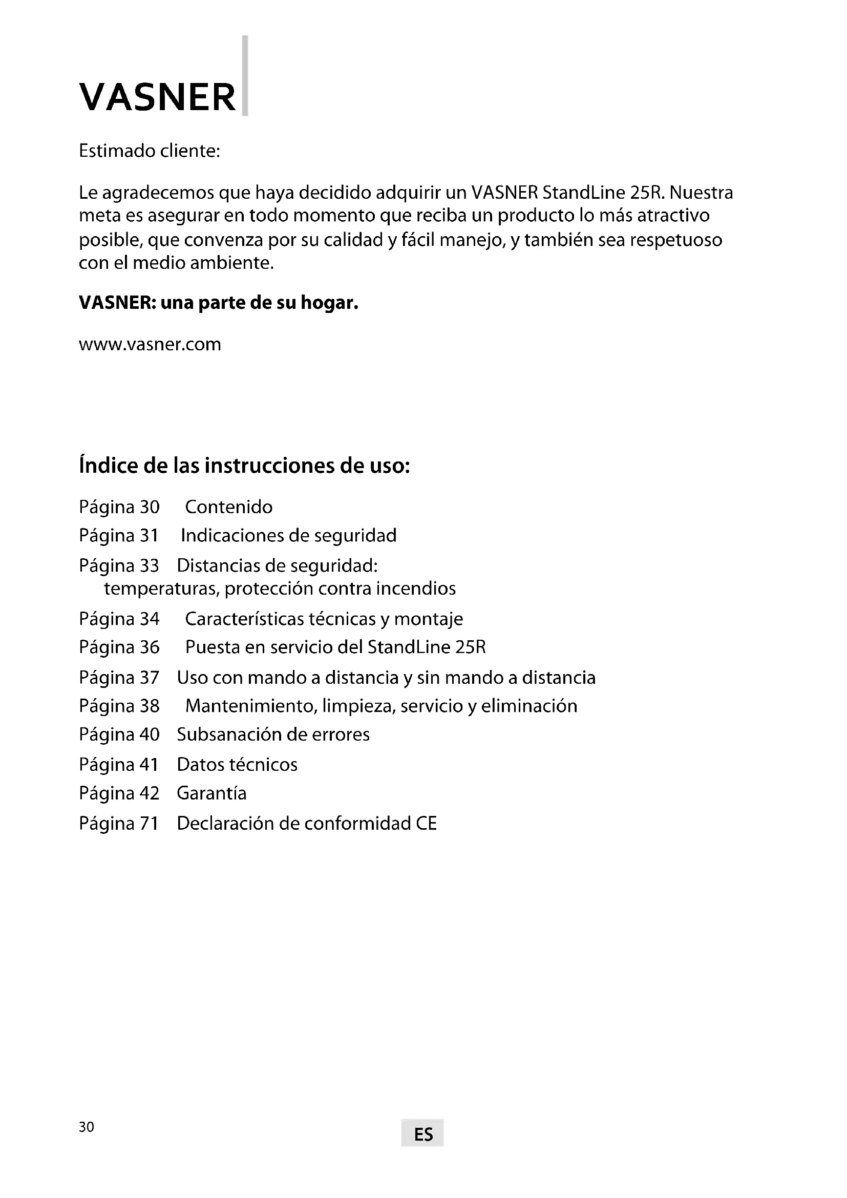 Estimado cliente: Le agradecemos que haya decidido adquirir un VASNER StandLine 25R. Nuestra meta es asegurar en todo momento que reciba un producto lo más atractivo posible, que convenza por su calidad y fácil manejo, y también sea respetuoso con el medio ambiente. VASNER: una parte de su hogar. www.vasner.com Índice de las instrucciones de uso: Página 30 Contenido Página 31 Indicaciones de seguridad Página 33 Distancias de seguridad: temperaturas, protección contra incendios Página 34 Características técnicas y montaje Página 36 Puesta en servicio del StandLine 25R Página 37 Uso con mando a distancia y sin mando a distancia Página 38 Mantenimiento, limpieza, servicio y eliminación Página 40 Subsanación de errores Página 41 Datos técnicos Página 42 Garantía Página 71 Declaración de conformidad CE