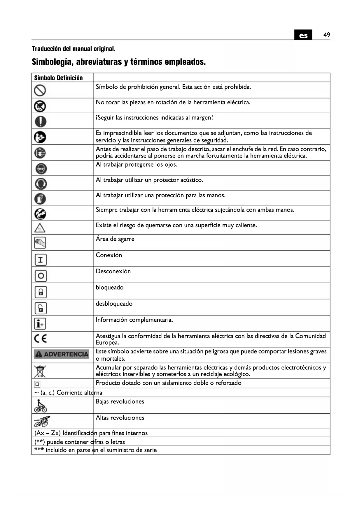 Traducción del manual original. Simbología, abreviaturas y términos empleados. Símbolo Definición Símbolo de prohibición general. Esta acción está prohibida. No tocar las piezas en rotación de la herramienta eléctrica. ¡Seguir las instrucciones indicadas al margen! Es imprescindible leer los documentos que se adjuntan, como las instrucciones de servicio y las instrucciones generales de seguridad. Antes de realizar el paso de trabajo descrito, sacar el enchufe de la red. En caso contrario, podría accidentarse al ponerse en marcha fortuitamente la herramienta eléctrica. Al trabajar protegerse los ojos. Al trabajar utilizar un protector acústico. Al trabajar utilizar una protección para las manos. Siempre trabajar con la herramienta eléctrica sujetándola con ambas manos. Existe el riesgo de quemarse con una superficie muy caliente. Área de agarre Conexión Desconexión bloqueado desbloqueado Información complementaria. Atestigua la conformidad de la herramienta eléctrica con las directivas de la Comunidad Europea. Este símbolo advierte sobre una situación peligrosa que puede comportar lesiones graves o mortales. Acumular por separado las herramientas eléctricas y demás productos electrotécnicos y eléctricos inservibles y someterlos a un reciclaje ecológico. Producto dotado con un aislamiento doble o reforzado ~ (a. c.) Corriente alterna Bajas revoluciones Altas revoluciones (Ax – Zx) Identificación para fines internos (**) puede contener cifras o letras *** incluido en parte en el suministro de serie ADVERTENCIA50