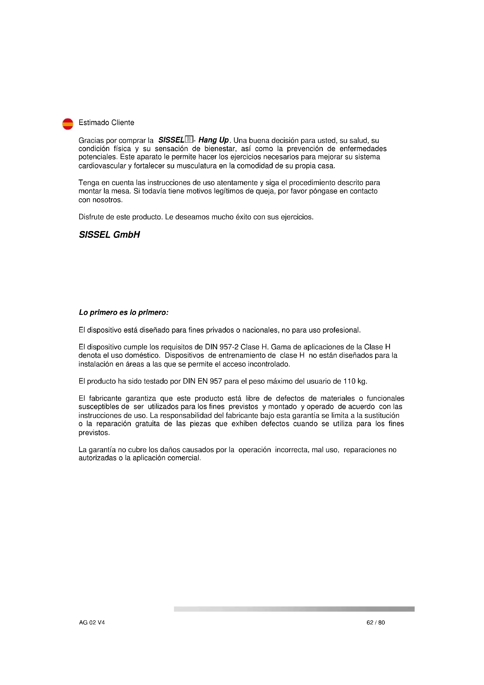 Gracias por comprar la SISSEL- Hang Up. Una buena decisión para usted, su salud, su condición física y su sensación de bienestar, así como la prevención de enfermedades potenciales. Este aparato le permite hacer los ejercicios necesarios para mejorar su sistema cardiovascular y fortalecer su musculatura en la comodidad de su propia casa.
