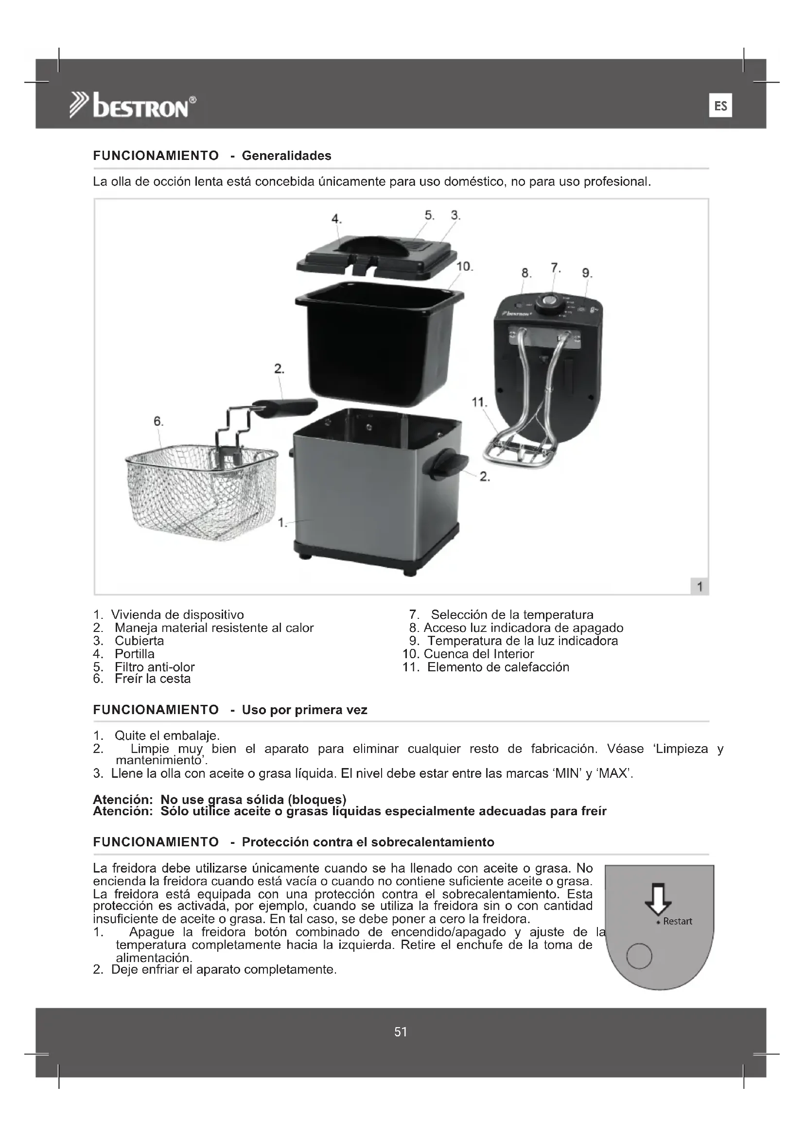 Atención: No use grasa sólida (bloques) Atención: Sólo utilice aceite o grasas líquidas especialmente adecuadas para freír FUNCIONAMIENTO - Protección contra el sobrecalentamiento La freidora debe utilizarse únicamente cuando se ha llenado con aceite o grasa. No encienda la freidora cuando está vacía o cuando no contiene suficiente aceite o grasa. La freidora está equipada con una protección contra el sobrecalentamiento. Esta protección es activada, por ejemplo, cuando se utiliza la freidora sin o con cantidad insuficiente de aceite o grasa. En tal caso, se debe poner a cero la freidora.