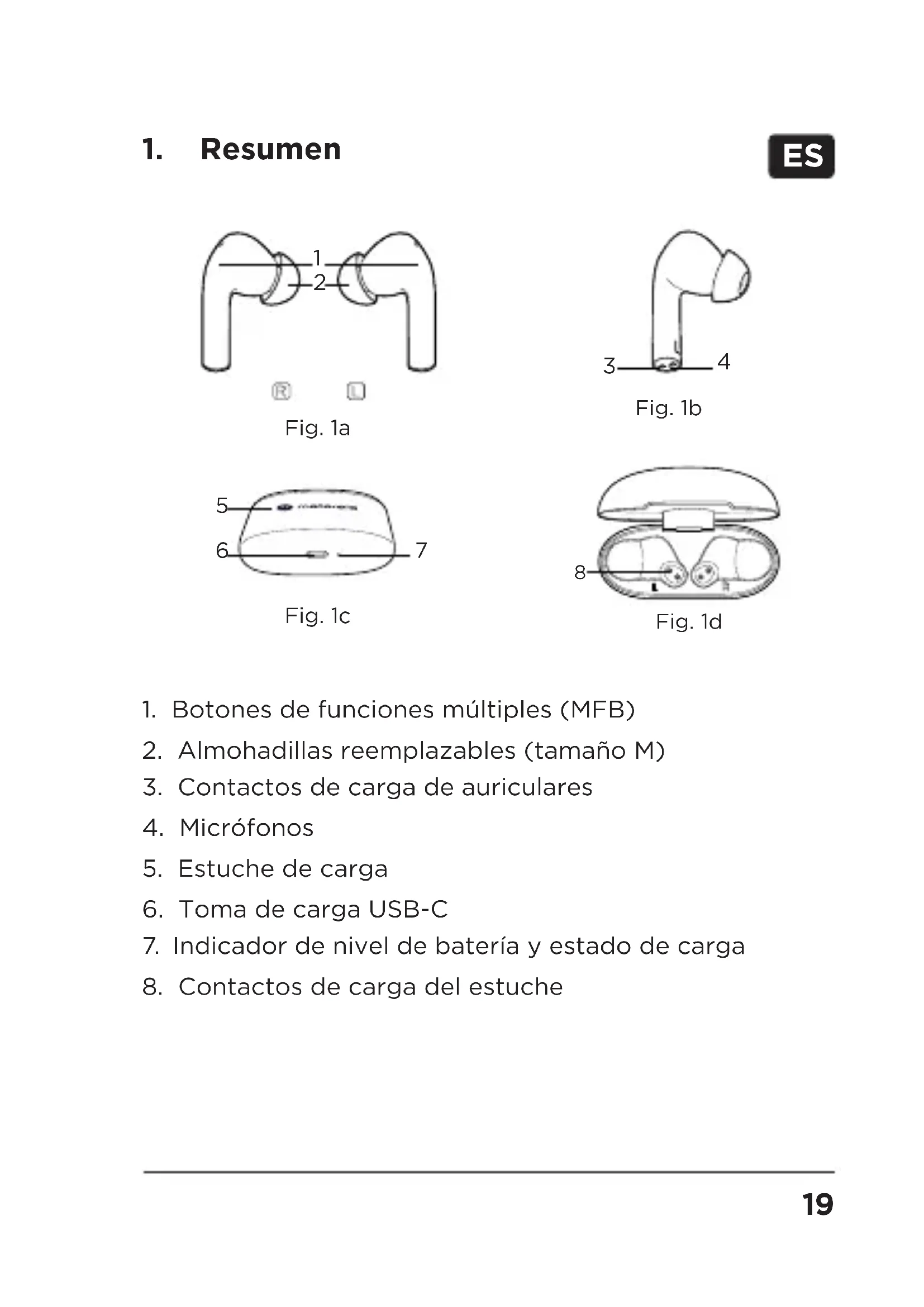 del estuche de carga y retire los auriculares del estuche de carga; los auriculares se encenderán automáticamente. (Consulte la sección 6)