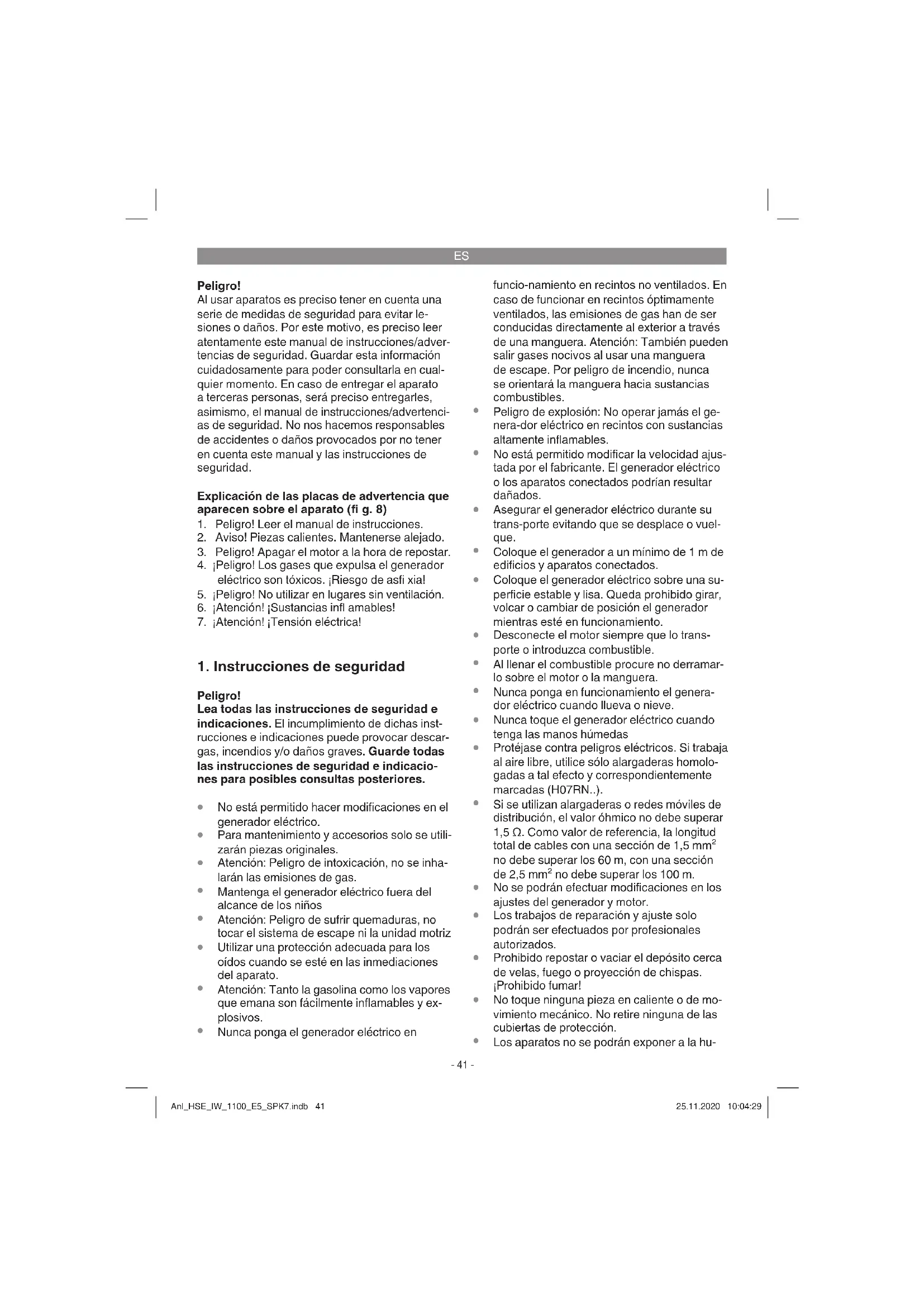 No conectar el generador a una red domésti- ca, puesto que esto podría dañar el genera- dor u otro aparato eléctrico doméstico. Aviso: Algunos aparatos eléctricos (sierras, taladros, etc.) pueden consumir más electricidad cuando se utilizan bajo condiciones muy duras. En caso de duda, consultar al fabricante del aparato. Anl_HSE_IW_1100_E5_SPK7.indb 44Anl_HSE_IW_1100_E5_SPK7.indb 44 25.11.2020 10:04:3125.11.2020 10:04:31ES