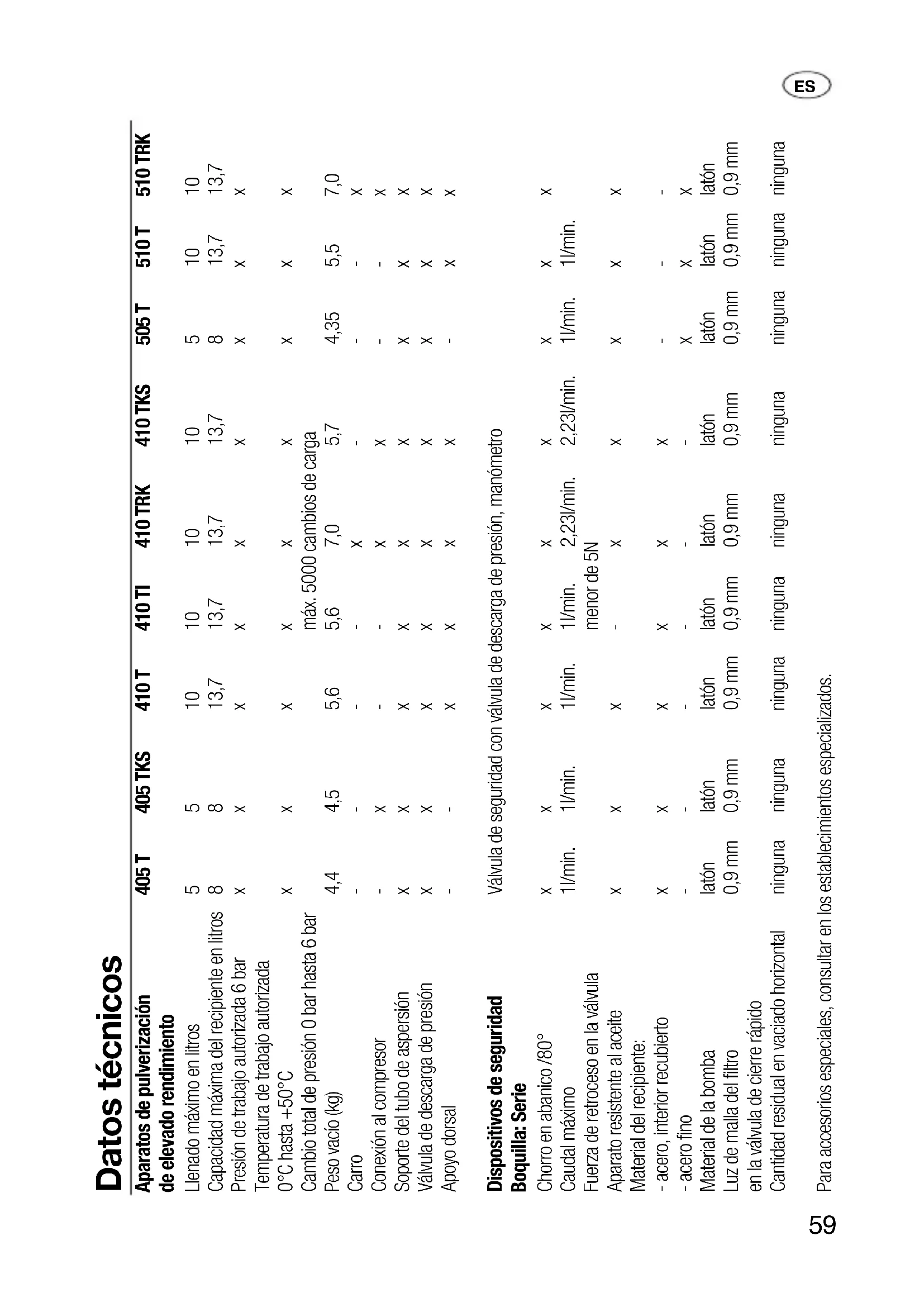 Datos técnicos Aparatos de pulverización 405 T 405 TKS 410 T 410 TI 410 TRK 410 TKS 505 T 510 T 510 TRK de elevado rendimiento Llenado máximo en litros 5 5 10 10 10 10 5 10 10 Capacidad máxima del recipiente en litros 8 8 13,7 13,7 13,7 13,7 8 13,7 13,7 Presión de trabajo autorizada 6 bar x x x x x x x x x Temperatura de trabajo autorizada 0°C hasta +50°C x x x x x x x x x Cambio total de presión 0 bar hasta 6 bar máx. 5000 cambios de carga Peso vacío (kg) 4,4 4,5 5,6 5,6 7,0 5,7 4,35 5,5 7,0 Carro - - - - x - - - x Conexión al compresor - x - - x x - - x Soporte del tubo de aspersión x x x x x x x x x Válvula de descarga de presión x x x x x x x x x Apoyo dorsal - - x x x x - x x Dispositivos de seguridad Válvula de seguridad con válvula de descarga de presión, manómetro Boquilla: Serie Chorro en abanico /80° x x x x x x x x x Caudal máximo 1l/min. 1l/min. 1l/min. 1l/min. 2,23l/min. 2,23l/min. 1l/min. 1l/min. Fuerza de retroceso en la válvula menor de 5N Aparato resistente al aceite x x x - x x x x x Material del recipiente: - acero, interior recubierto x x x x x x - - - - acero fino - - - - - - x x x Material de la bomba latón latón latón latón latón latón latón latón latón Luz de malla del filtro 0,9 mm 0,9 mm 0,9 mm 0,9 mm 0,9 mm 0,9 mm 0,9 mm 0,9 mm 0,9 mm en la válvula de cierre rápido Cantidad residual en vaciado horizontal ninguna ninguna ninguna ninguna ninguna ninguna ninguna ninguna ninguna Para accesorios especiales, consultar en los establecimientos especializados.60 Índice Datos técnicos 59 Indicaciones de seguridad importantes 60 Puesta inicial en marcha 62 Pulverización 65 Montaje del carro 65 Vaciado y mantenimiento 66 Sugerencias 67 Declaración de conformidad 68 Indicaciones de seguridad importantes Las reparaciones de los aparatos GLORIA para el jardín y la casa deben ser realizados solamente por los centros de Servicio de GLORIA. Encargue los repuestos a su proveedor especializado GLORIA. Si no los tiene disponi- bles, se los conseguirá rápida- mente. l Estos aparatos de pulverización de elevado rendimiento GLORIA son idóneos para la aplicación de líqui- dos (para fluídos del grupo 2 según Directiva RL97/23/CE) en los secto- res de hobby, trabajos artesanales e industria. l Utilizar únicamente productos puros, disponibles en el comercio (valor pH 5-10). Si se mezclan diferentes pro- ductos es posible que surjan reac- ciones químicas peligrosas imprevisi- bles. No deben llenarse los recipien- tes con sustancias de la gama ácida valor pH ≤ 5, así como con disolucio- nes y medios fuertemente cáusticos. l Observar las advertencias de seguri- dad de los fabricantes de los pro- ductos a pulverizar. Determinados productos a pulverizar requieren mascarillas, gafas y guantes de pro- tección, así como otras medidas de precaución. l Observar las directrices ZH 1/406 para dispersores de líquidos: En caso necesario, pero al menos cada 12 meses, los dispersores de líqui- dos deben ser examinados por ex- pertos, para verificar si siguen es- tando en condiciones de ser utiliza- dos sin riesgo. Es preciso observar las instrucciones del fabricante. En el caso de aparatos inutilizados, la verificación puede aplazarse hasta la próxima puesta en servicio. (véase vaciado y mantenimiento) l No se permite el uso de mezclas in- flamables explosivas. Excepción: en áreas donde no existe peligro de ex- plosión. En este caso observar la di- rectiva de protección contra explo- siones (EX-RL), así como el61 reglamento sobre líquidos inflama- bles (VbF). Almacenar el aparato en un lugar bien ventilado, mantenerlo alejado de focos de ignición y sus- tancias inflamables, no fumar. El contenido no debe llegar a la red de alcantarillado. Evitar la carga elec- trostática mediante toma de tierra (véase puesta en servicio). En caso de incendio utilizar material extintor de la categoría B (polvo, espuma,