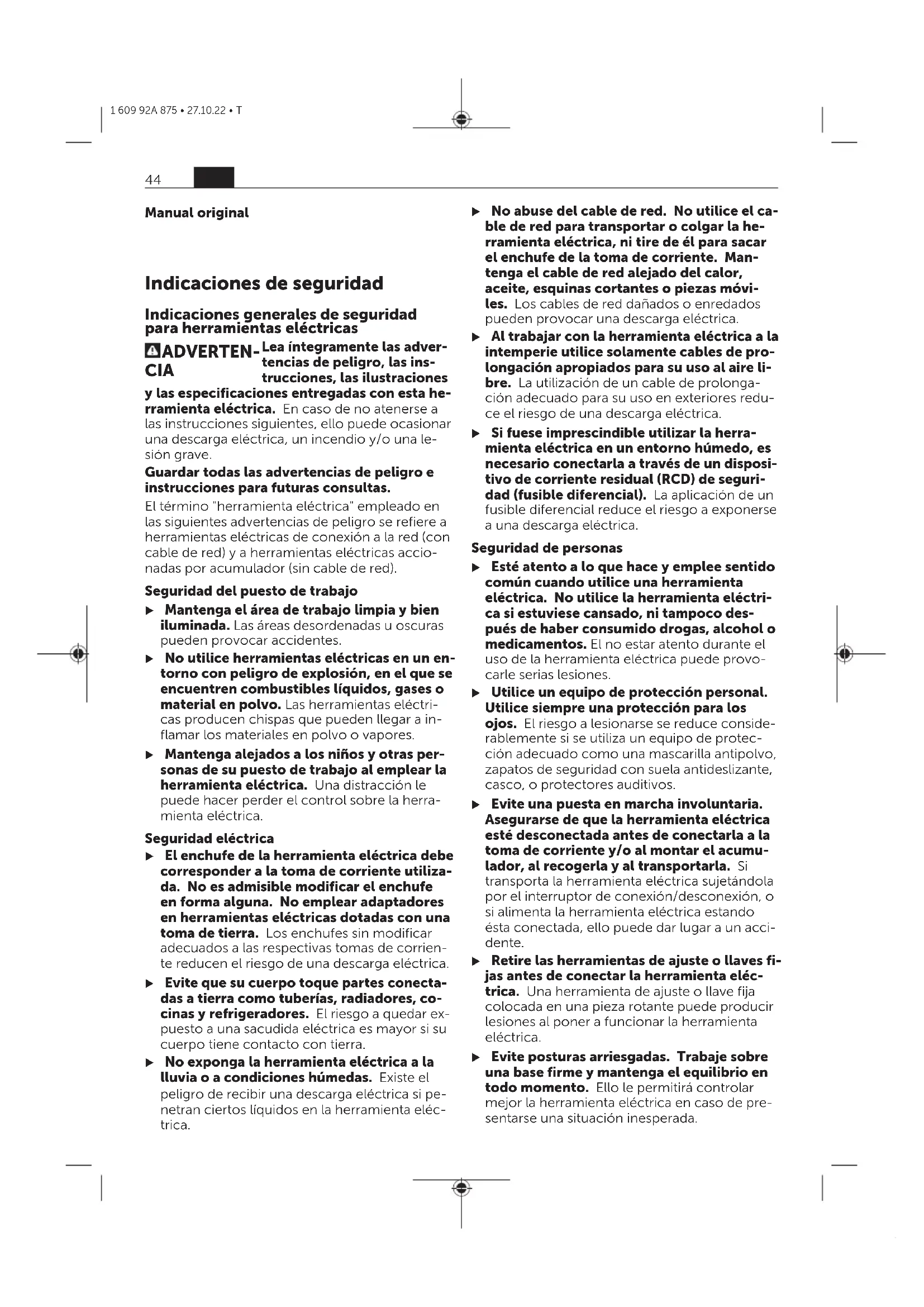 (Las indicaciones para el serrado de planchas de virutas aglomeradas son válidas para un espesor de pieza de trabajo de 20mm.) El nivel de vibraciones y el valor de emisiones de ruidos indicados en estas instrucciones han sido determinados según un procedimiento de medi- ción normalizado y pueden servir como base de comparación con otras herramientas eléctricas. También son adecuados para estimar provisio- nalmente la emisión de vibraciones y ruidos. El nivel de vibraciones y el valor de emisiones de ruidos indicados han sido determinados para las aplicaciones principales de la herramienta eléc- trica. Por ello, el nivel de vibraciones y el valor de emisiones de ruidos pueden ser diferentes si la herramienta eléctrica se utiliza para otras aplica- ciones, con útiles diferentes, o si el manteni- miento de la misma fuese deficiente. Ello puede suponer un aumento drástico de la emisión de vibraciones y de ruidos durante el tiempo total de trabajo. Para determinar con exactitud las emisiones de vibraciones y de ruidos, es necesario considerar también aquellos tiempos en los que el aparato esté desconectado, o bien, esté en funciona- miento, pero sin ser utilizado realmente. Ello puede suponer una disminución drástica de las es 47 1 609 92A 875 • 27.10.22 • Temisiones de vibraciones y de ruidos durante el tiempo total de trabajo. Fije unas medidas de seguridad adicionales para proteger al usuario de los efectos por vibracio- nes, como por ejemplo: Mantenimiento de la he- rramienta eléctrica y de los útiles, conservar ca- lientes las manos, organización de las secuencias de trabajo. AcumuladorEspañol Carga del acumuladorEspañol u Utilice únicamente los cargadores que se enumeran en los datos técnicos. Solamente estos cargadores han sido especialmente adaptados a los acumuladores de iones de litio empleados en su herramienta eléctrica. Indicación: Los acumuladores de iones de litio se entregan parcialmente cargados debido a la normativa de transporte internacional. Con el fin de obtener la plena potencia del acumulador, cargue completamente el acumulador antes de su primer uso. Montaje del acumuladorEspañol Desplace el acumulador cargado en el aloja- miento del acumulador, hasta que encastre per- ceptible. Desmontaje del acumuladorEspañol Para la extracción del acumulador, presione la tecla de desenclavamiento y retire el acumula- dor. No proceda con brusquedad. El acumulador dispone de 2etapas de enclava- miento para evitar que se salga en el caso de un accionamiento accidental de la tecla de desen- clavamiento del acumulador. Mientras la batería esté montada en la herramienta eléctrica, per- manecerá retenida en su posición mediante un resorte. Indicador del estado de carga del acumuladorEspañol Los LEDs verdes del indicador del estado de car- ga del acumulador indican el estado de carga del acumulador. Por motivos de seguridad, la con- sulta del estado de carga es solo posible con la herramienta eléctrica parada. Presione la tecla del indicador de estado de car- ga o , para indicar el estado de carga. Esto también es posible con el acumulador desmon- tado. Si tras presionar la tecla del indicador de estado de carga no se enciende ningún LED, significa que el acumulador está defectuoso y debe susti- tuirse. Tipo de acumulador GBA18V...Español Diodo luminoso (LED) Capacidad Luz permanente 3× verde 60–100% Luz permanente 2× verde 30–60% Luz permanente 1× verde 5–30% Luz intermitente 1× verde 0–5% Tipo de acumulador ProCORE18V...Español Diodo luminoso (LED) Capacidad Luz permanente 5× verde 80–100% Luz permanente 4× verde 60–80% Luz permanente 3× verde 40–60% Luz permanente 2× verde 20–40% Luz permanente 1× verde 5–20% Luz intermitente 1× verde 0–5% Indicaciones para el trato óptimo del acumuladorEspañol Proteja el acumulador de la humedad y del agua. Únicamente almacene el acumulador en el mar- gen de temperatura desde −20°C hasta 50°C. P.ej., no deje el acumulador en el coche en vera- no. Limpie de vez en cuando las rejillas de refrigera- ción del acumulador con un pincel suave, limpio y seco. Si después de una recarga, el tiempo de funcio- namiento del acumulador fuese muy reducido, ello es señal de que éste está agotado y deberá sustituirse. Observe las indicaciones referentes a la elimina- ción. MontajeEspañol u Desmonte el acumulador antes de manipu- lar la herramienta eléctrica (p. ej. en el man- tenimiento, cambio de útil, etc.) así como al transportarla y guardarla. En caso contrario podría accidentarse al accionar fortuitamente el interruptor de conexión/desconexión. Montaje y cambio de la hoja de sierraEspañol u Al montar o cambiar el útil utilice unos guantes de protección. Los útiles son afila- dos y se pueden calentar con el uso prolonga- do. u Al cambiar la hoja de sierra, preste atención a que en el alojamiento de la hoja de sierra 48 es 1 609 92A 875 • 27.10.22 • Tno queden restos de material como, p.ej., virutas de madera o metal. Selección de la hoja de sierraEspañol Utilice únicamente hojas de sierra con vástago universal de 1/2". La longitud de la hoja de sierra no debe superar la estimada para el corte. Montaje de la hoja de sierra (ver figuraA)Español Gire el casquillo de retención(3) aprox. 90° en dirección de la flecha y sujételo firmemente. Pre- sione la hoja de sierra(1) en el alojamiento de la hoja de sierra(10). Suelte de nuevo el casquillo de retención. u Tire de la hoja de sierra para comprobar que la sujeción sea firme. Una hoja de sierra suelta puede caerse y provocarle lesiones. Para determinados trabajos, se puede girar la ho- ja de sierra(1) 180° (los dientes apuntan hacia arriba) y volver a introducirse. Retirar la hoja de sierra (ver figuraB)Español u Deje enfriar la hoja de sierra antes del des- montaje. Existe peligro de lesiones si se toca la hoja de sierra caliente. Gire el casquillo de retención(3) aprox. 90° en dirección de la flecha