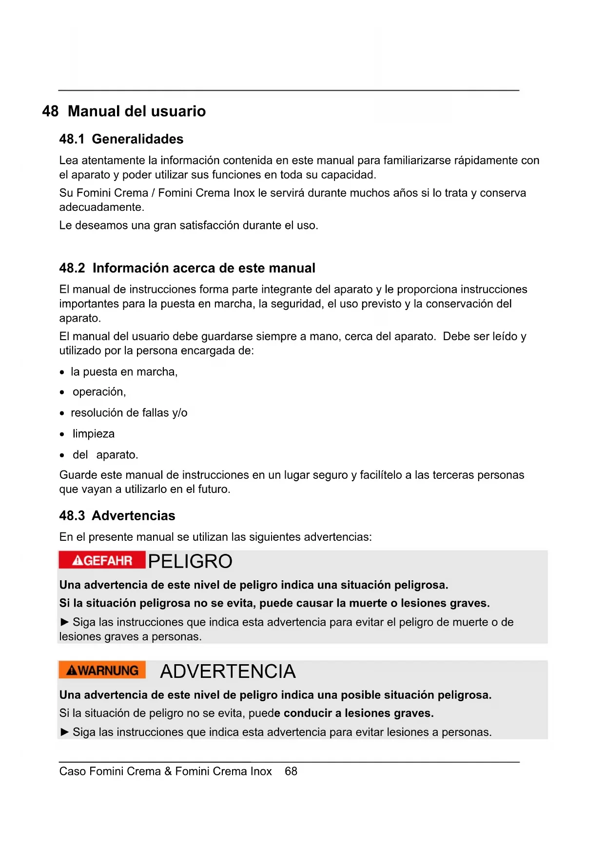 En el presente manual se utilizan las siguientes advertencias: PELIGRO Una advertencia de este nivel de peligro indica una situación peligrosa. Si la situación peligrosa no se evita, puede causar la muerte o lesiones graves. ► Siga las instrucciones que indica esta advertencia para evitar el peligro de muerte o de lesiones graves a personas. ADVERTENCIA Una advertencia de este nivel de peligro indica una posible situación peligrosa. Si la situación de peligro no se evita, puede conducir a lesiones graves. ► Siga las instrucciones que indica esta advertencia para evitar lesiones a personas.Caso Fomini Crema & Fomini Crema Inox 69 PRECAUCIÓN Una advertencia de este nivel de peligro indica una posible situación peligrosa. Si la situación de peligro no se evita, puede conducir a lesiones de gravedad moderada a leve. ► Siga las instrucciones que indica esta advertencia para evitar lesiones a personas. NOTA Esta indicación proporciona información adicional que facilitará el manejo de la máquina.