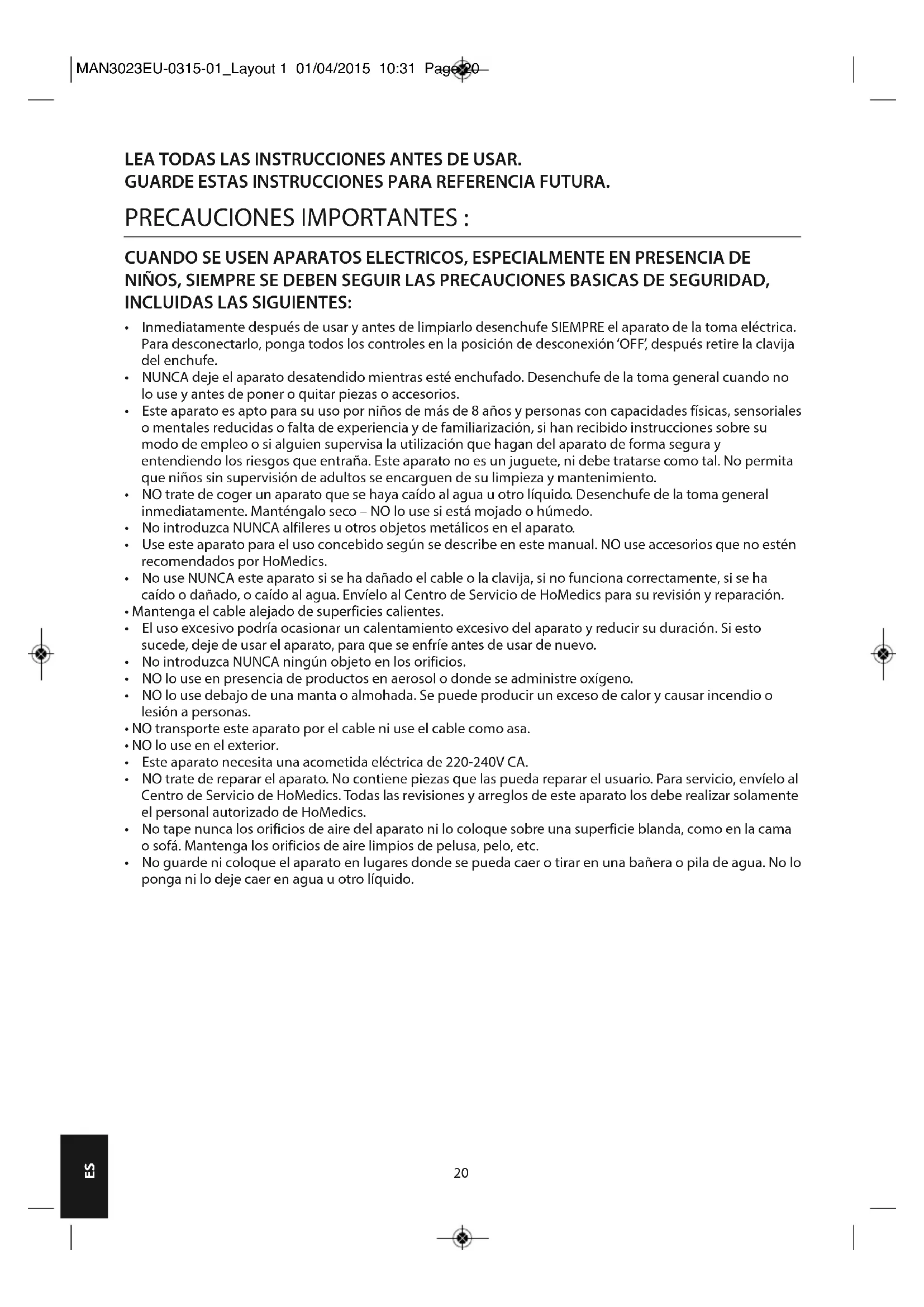 - No use NUNCA este aparato si se ha dañado el cable o la clavija, si no funciona correctamente, si se ha caído o dañado, o caído al agua. Envíelo al Centro de Servicio de HoMedics para su revisión y reparación.