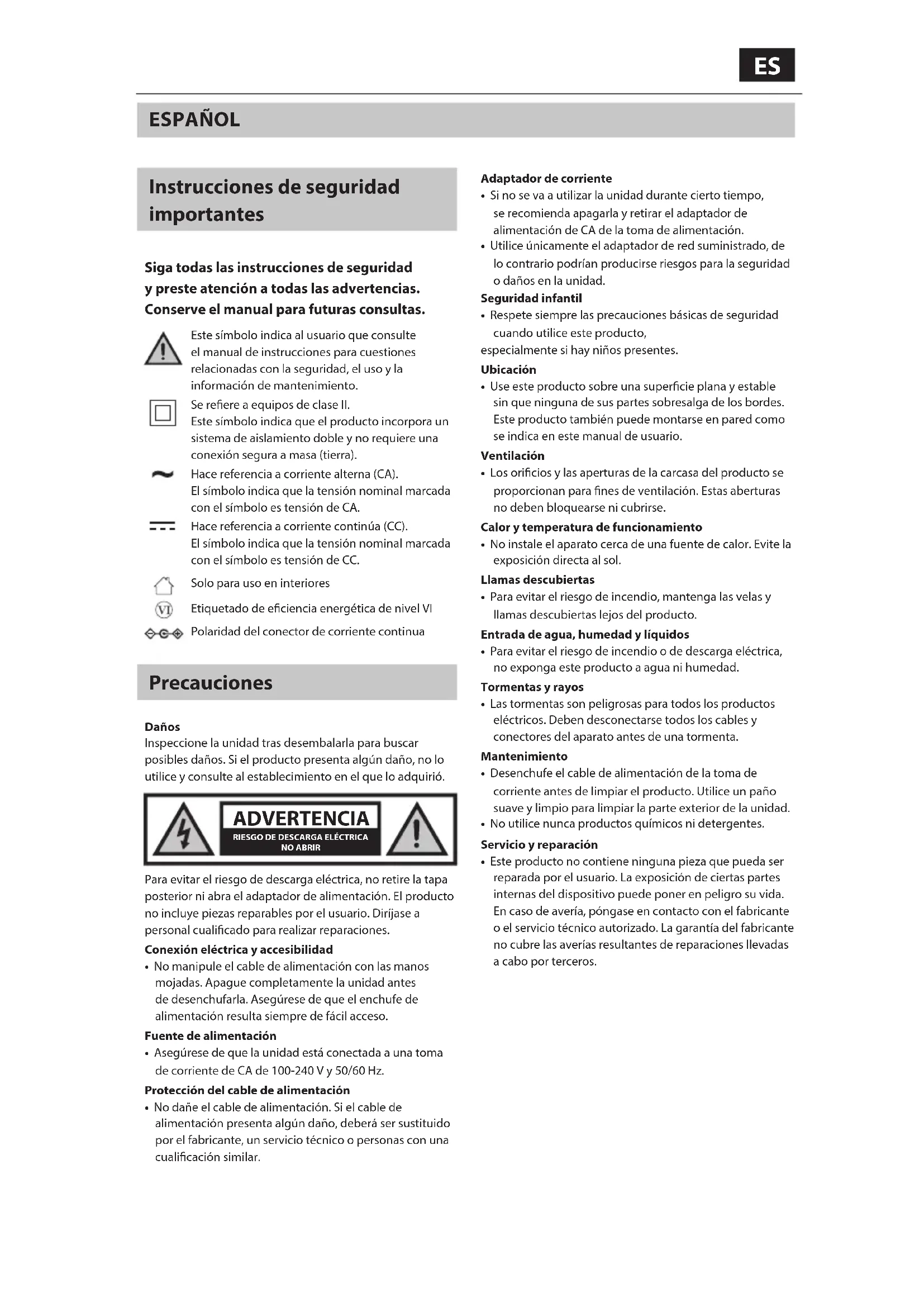 Este símbolo indica al usuario que consulte el manual de instrucciones para cuestiones relacionadas con la seguridad, el uso y la información de mantenimiento.Se reere a equipos de claseII.Este símbolo indica que el producto incorpora un sistema de aislamiento doble y no requiere una conexión segura a masa (tierra).Hace referencia a corriente alterna (CA).El símbolo indica que la tensión nominal marcada con el símbolo es tensión de CA.Hace referencia a corriente continúa (CC). El símbolo indica que la tensión nominal marcada con el símbolo es tensión de CC.Solo para uso en interioresEtiquetado de eciencia energética de nivelVIPolaridad del conector de corriente continua Precauciones DañosInspeccione la unidad tras desembalarla para buscar posibles daños. Si el producto presenta algún daño, no lo utilice y consulte al establecimiento en el que lo adquirió. ADVERTENCIA RIESGO DE DESCARGA ELÉCTRICANO ABRIRPara evitar el riesgo de descarga eléctrica, no retire la tapa posterior ni abra el adaptador de alimentación. El producto no incluye piezas reparables por el usuario. Diríjase a personal cualicado para realizar reparaciones.Conexión eléctrica y accesibilidad• No manipule el cable de alimentación con las manos mojadas. Apague completamente la unidad antes de desenchufarla. Asegúrese de que el enchufe de alimentación resulta siempre de fácil acceso.Fuente de alimentación• Asegúrese de que la unidad está conectada a una toma de corriente de CA de 100-240V y 50/60Hz.Protección del cable de alimentación• No dañe el cable de alimentación. Si el cable de alimentación presenta algún daño, deberá ser sustituido por el fabricante, un servicio técnico o personas con una cualicación similar.Adaptador de corriente• Si no se va a utilizar la unidad durante cierto tiempo, se recomienda apagarla y retirar el adaptador de alimentación de CA de la toma de alimentación.• Utilice únicamente el adaptador de red suministrado, de lo contrario podrían producirse riesgos para la seguridad o daños en la unidad.Seguridad infantil• Respete siempre las precauciones básicas de seguridad cuando utilice este producto,especialmente si hay niños presentes.Ubicación• Use este producto sobre una supercie plana y estable sin que ninguna de sus partes sobresalga de los bordes. Este producto también puede montarse en pared como se indica en este manual de usuario.Ventilación• Los oricios y las aperturas de la carcasa del producto se proporcionan para nes de ventilación. Estas aberturas no deben bloquearse ni cubrirse.Calor y temperatura de funcionamiento• No instale el aparato cerca de una fuente de calor. Evite la exposición directa al sol.Llamas descubiertas• Para evitar el riesgo de incendio, mantenga las velas y llamas descubiertas lejos del producto.Entrada de agua, humedad y líquidos• Para evitar el riesgo de incendio o de descarga eléctrica, no exponga este producto a agua ni humedad.Tormentas y rayos• Las tormentas son peligrosas para todos los productos eléctricos. Deben desconectarse todos los cables y conectores del aparato antes de una tormenta.Mantenimiento• Desenchufe el cable de alimentación de la toma de corriente antes de limpiar el producto. Utilice un paño suave y limpio para limpiar la parte exterior de la unidad.• No utilice nunca productos químicos ni detergentes.Servicio y reparación• Este producto no contiene ninguna pieza que pueda ser reparada por el usuario. La exposición de ciertas partes internas del dispositivo puede poner en peligro su vida. En caso de avería, póngase en contacto con el fabricante o el servicio técnico autorizado. La garantía del fabricante no cubre las averías resultantes de reparaciones llevadas a cabo por terceros.32 Eliminación de este equipo Información dirigida a los usuarios relativa a la recogida y eliminación de equipos antiguos. Este símbolo indica que el producto está previsto en la Directiva Europea 2012/19/ UE y que no debe eliminarse con la basura doméstica normal. Este símbolo indica que el producto se ha diseñado y fabricado para poder reciclarse y reutilizarse. Estos símbolos incluidos en los productos, los embalajes o los documentos acompañantes indican que los productos eléctricos y electrónicos, y las baterías o pilas no deben mezclarse con la basura doméstica general. Los usuarios deben ponerse en contacto con el establecimiento comercial en el que compraron el producto o en las ocinas públicas locales para obtener detalles sobre dónde y cómo puede reciclar estos artículos de forma respetuosa con el medio ambiente. Declaración de CE y de CA del Reino Unido: